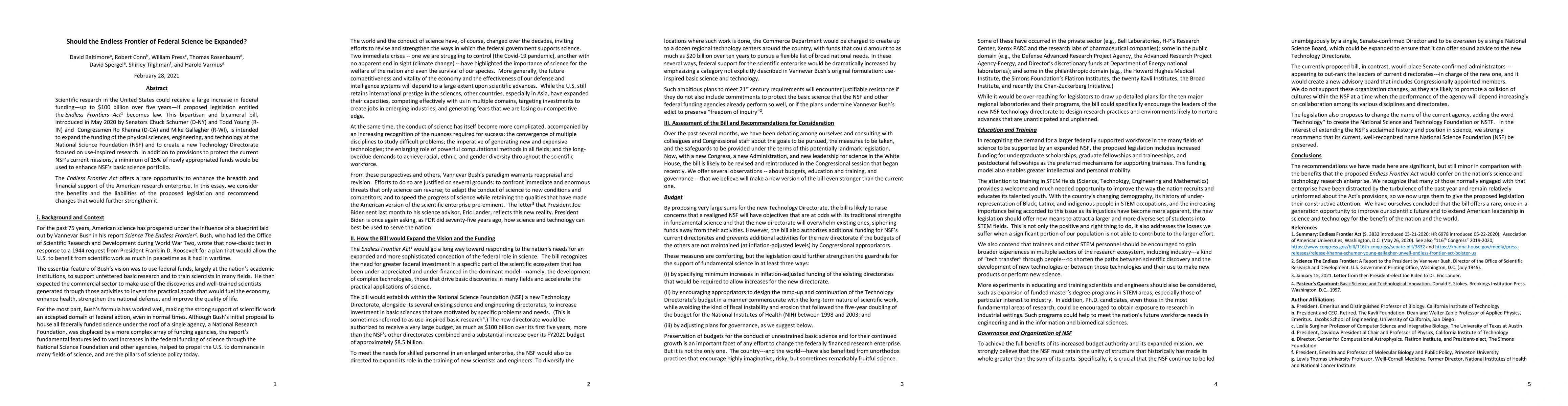 Scientific research in the United States could receive a large increase in federal funding--up to 100 billion dollars over five years -- if proposed legislation entitled the Endless Frontiers Act becomes law. This bipartisan and bicameral bill, introduced in May 2020 by Senators Chuck Schumer (D-NY) and Todd Young (R-IN) and Congressmen Ro Khanna (D-CA) and Mike Gallagher (R-WI), is intended to expand the funding of the physical sciences, engineering, and technology at the National Science Foundation (NSF) and create a new Technology Directorate focused on use-inspired research. In addition to provisions to protect the NSF's current missions, a minimum of 15\% of the newly appropriated funds would be used to enhance NSF's basic science portfolio. The Endless Frontier Act offers a rare opportunity to enhance the breadth and financial support of the American research enterprise. In this essay, we consider the benefits and the liabilities of the proposed legislation and recommend changes that would further strengthen it.