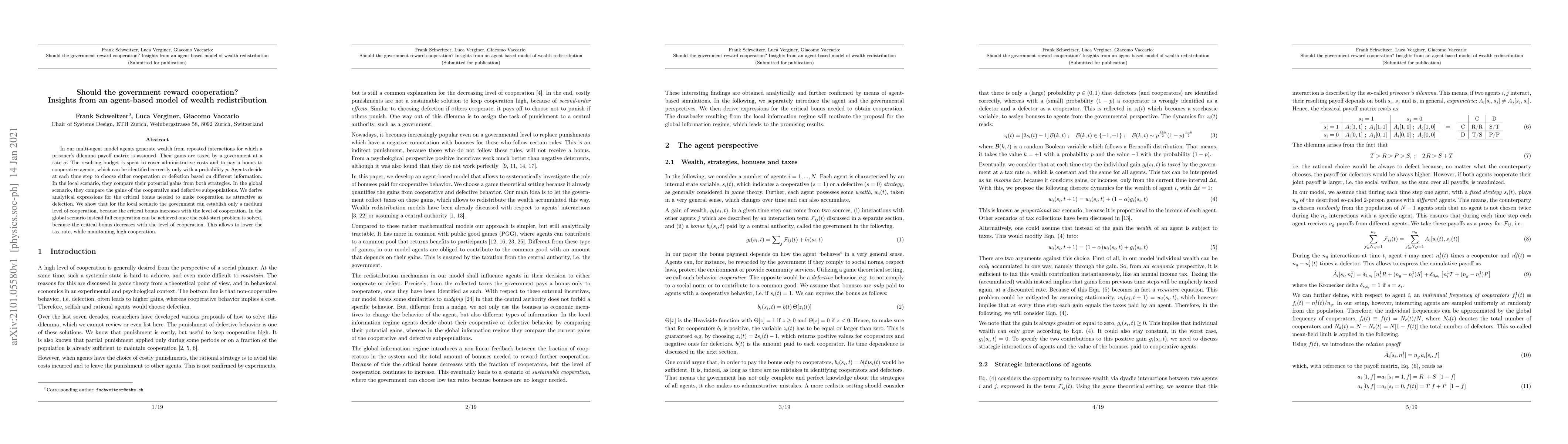 In our multi-agent model agents generate wealth from repeated interactions for which a prisoner's dilemma payoff matrix is assumed. Their gains are taxed by a government at a rate $\alpha$. The resulting budget is spent to cover administrative costs and to pay a bonus to cooperative agents, which can be identified correctly only with a probability $p$. Agents decide at each time step to choose either cooperation or defection based on different information. In the local scenario, they compare their potential gains from both strategies. In the global scenario, they compare the gains of the cooperative and defective subpopulations. We derive analytical expressions for the critical bonus needed to make cooperation as attractive as defection. We show that for the local scenario the government can establish only a medium level of cooperation, because the critical bonus increases with the level of cooperation. In the global scenario instead full cooperation can be achieved once the cold-start problem is solved, because the critical bonus decreases with the level of cooperation. This allows to lower the tax rate, while maintaining high cooperation.
