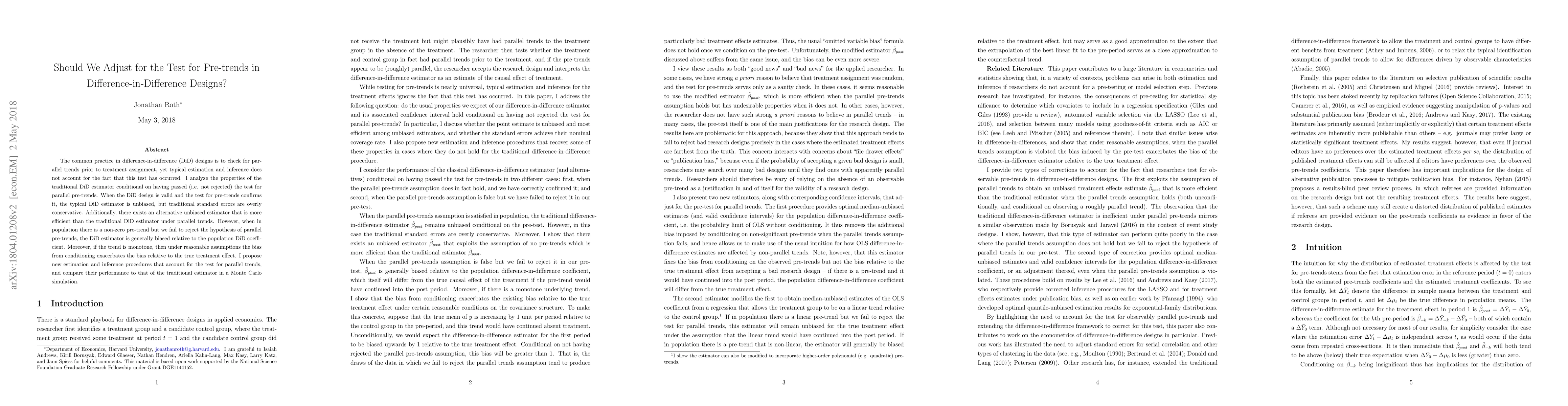 This paper examines the implications of testing for pre-trends in difference-in-difference designs and finds that traditional estimators are biased when pre-trends are present but undetected. It proposes new estimation methods that adjust for the pre-trend test, showing improved efficiency and bias reduction in simulations.