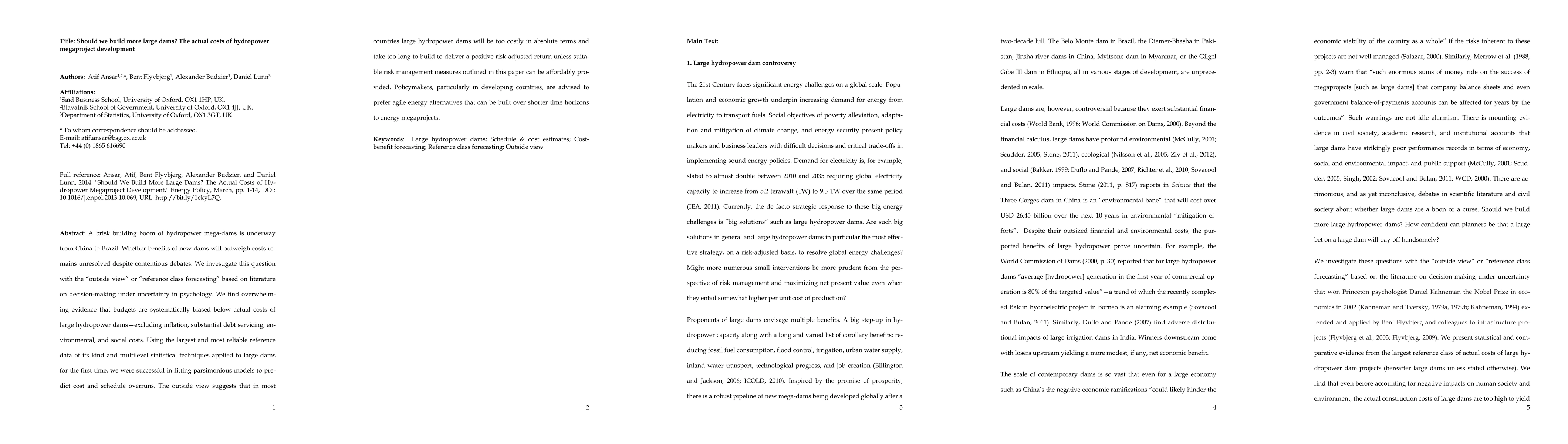 A brisk building boom of hydropower mega-dams is underway from China to Brazil. Whether benefits of new dams will outweigh costs remains unresolved despite contentious debates. We investigate this question with the "outside view" or "reference class forecasting" based on literature on decision-making under uncertainty in psychology. We find overwhelming evidence that budgets are systematically biased below actual costs of large hydropower dams - excluding inflation, substantial debt servicing, environmental, and social costs. Using the largest and most reliable reference data of its kind and multilevel statistical techniques applied to large dams for the first time, we were successful in fitting parsimonious models to predict cost and schedule overruns. The outside view suggests that in most countries large hydropower dams will be too costly in absolute terms and take too long to build to deliver a positive risk-adjusted return unless suitable risk management measures outlined in this paper can be affordably provided. Policymakers, particularly in developing countries, are advised to prefer agile energy alternatives that can be built over shorter time horizons to energy megaprojects.