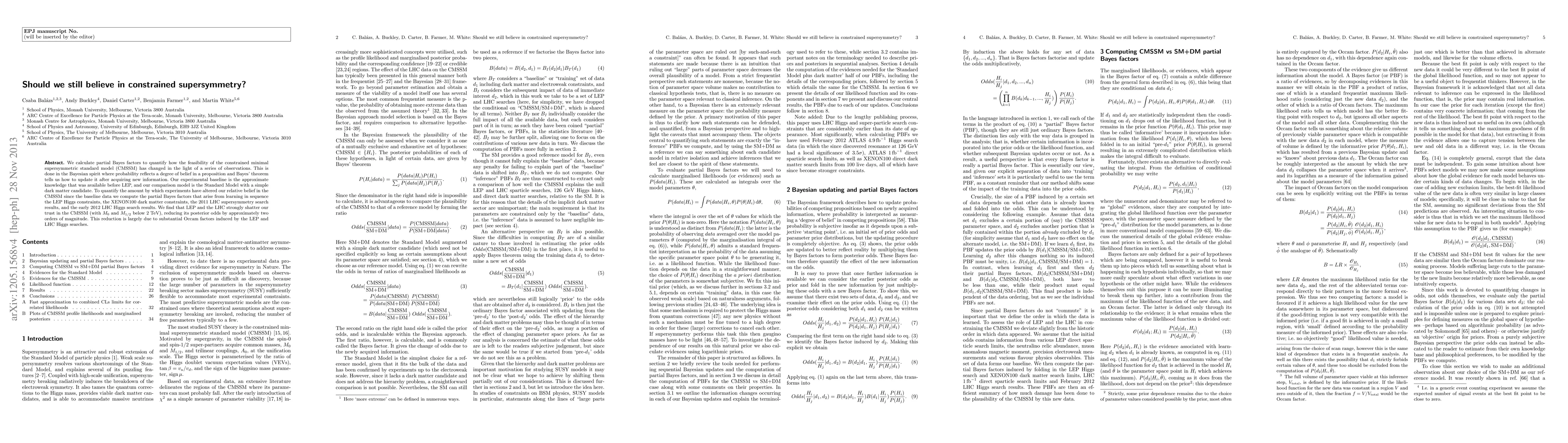 We calculate Bayes factors to quantify how the feasibility of the constrained minimal supersymmetric standard model (CMSSM) has changed in the light of a series of observations. This is done in the Bayesian spirit where probability reflects a degree of belief in a proposition and Bayes' theorem tells us how to update it after acquiring new information. Our experimental baseline is the approximate knowledge that was available before LEP, and our comparison model is the Standard Model with a simple dark matter candidate. To quantify the amount by which experiments have altered our relative belief in the CMSSM since the baseline data we compute the Bayes factors that arise from learning in sequence the LEP Higgs constraints, the XENON100 dark matter constraints, the 2011 LHC supersymmetry search results, and the early 2012 LHC Higgs search results. We find that LEP and the LHC strongly shatter our trust in the CMSSM (with $M_0$ and $M_{1/2}$ below 2 TeV), reducing its posterior odds by a factor of approximately two orders of magnitude. This reduction is largely due to substantial Occam factors induced by the LEP and LHC Higgs searches.