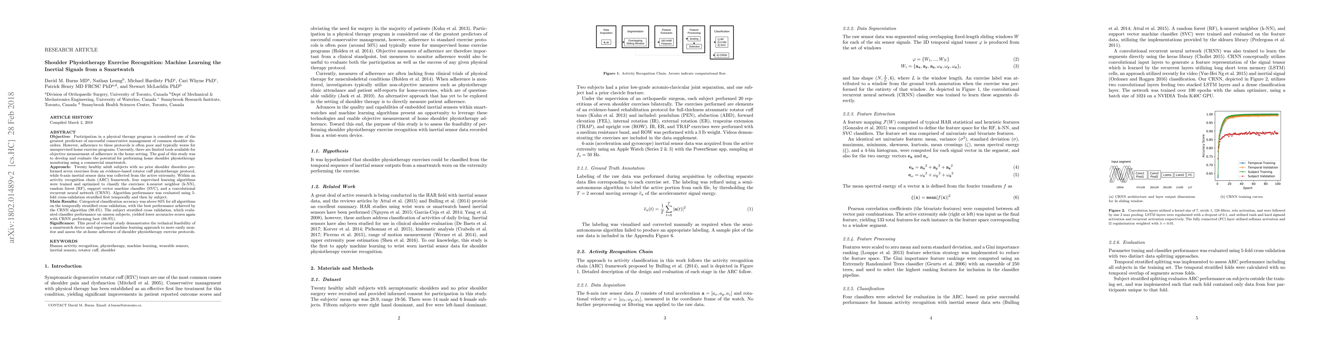 Objective: Participation in a physical therapy program is considered one of the greatest predictors of successful conservative management of common shoulder disorders. However, adherence to these protocols is often poor and typically worse for unsupervised home exercise programs. Currently, there are limited tools available for objective measurement of adherence in the home setting. The goal of this study was to develop and evaluate the potential for performing home shoulder physiotherapy monitoring using a commercial smartwatch. Approach: Twenty healthy adult subjects with no prior shoulder disorders performed seven exercises from an evidence-based rotator cuff physiotherapy protocol, while 6-axis inertial sensor data was collected from the active extremity. Within an activity recognition chain (ARC) framework, four supervised learning algorithms were trained and optimized to classify the exercises: k-nearest neighbor (k-NN), random forest (RF), support vector machine classifier (SVC), and a convolutional recurrent neural network (CRNN). Algorithm performance was evaluated using 5-fold cross-validation stratified first temporally and then by subject. Main Results: Categorical classification accuracy was above 94% for all algorithms on the temporally stratified cross validation, with the best performance achieved by the CRNN algorithm (99.4%). The subject stratified cross validation, which evaluated classifier performance on unseen subjects, yielded lower accuracies scores again with CRNN performing best (88.9%). Significance: This proof of concept study demonstrates the technical feasibility of a smartwatch device and supervised machine learning approach to more easily monitor and assess the at-home adherence of shoulder physiotherapy exercise protocols.