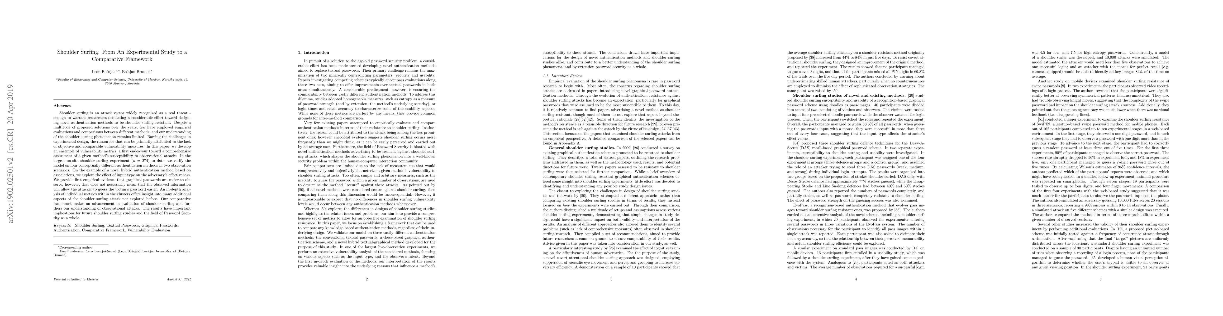 This paper develops a comprehensive framework and set of vulnerability metrics for evaluating shoulder surfing attacks, and conducts the largest on-site experiment to date (n = 274) comparing four authentication methods. The study reveals that graphical passwords are more easily observed but not necessarily more guessable, providing valuable insights for future research in password security.