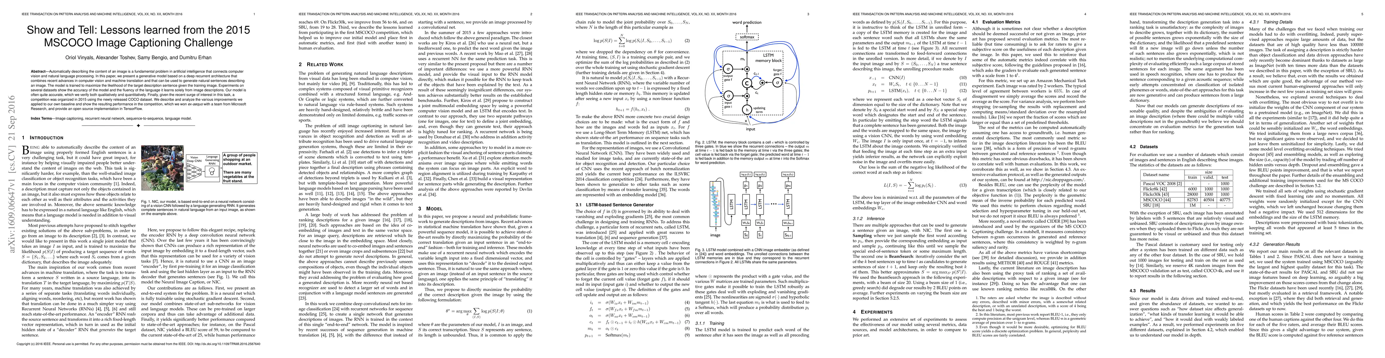 Automatically describing the content of an image is a fundamental problem in artificial intelligence that connects computer vision and natural language processing. In this paper, we present a generative model based on a deep recurrent architecture that combines recent advances in computer vision and machine translation and that can be used to generate natural sentences describing an image. The model is trained to maximize the likelihood of the target description sentence given the training image. Experiments on several datasets show the accuracy of the model and the fluency of the language it learns solely from image descriptions. Our model is often quite accurate, which we verify both qualitatively and quantitatively. Finally, given the recent surge of interest in this task, a competition was organized in 2015 using the newly released COCO dataset. We describe and analyze the various improvements we applied to our own baseline and show the resulting performance in the competition, which we won ex-aequo with a team from Microsoft Research, and provide an open source implementation in TensorFlow.