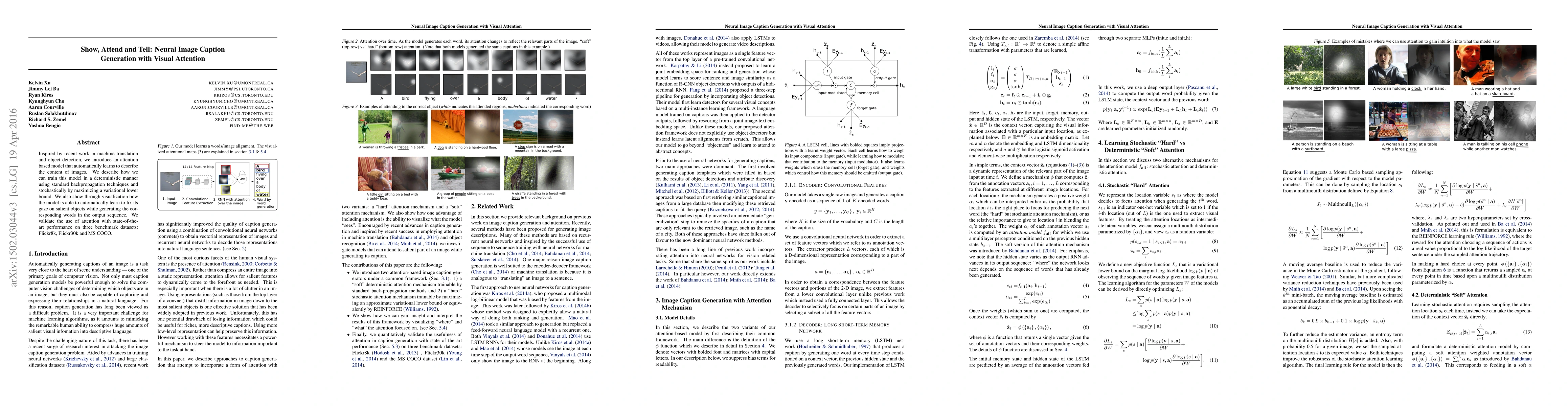 This paper introduces an attention-based model that can automatically generate image captions by focusing on salient objects and learning to describe their content. The model achieves state-of-the-art performance on three benchmark datasets.