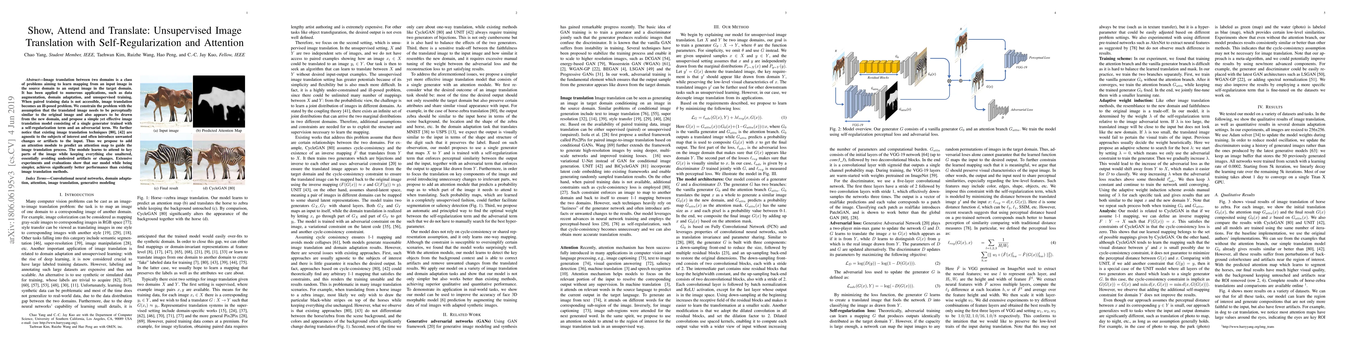 Image translation between two domains is a class of problems aiming to learn mapping from an input image in the source domain to an output image in the target domain. It has been applied to numerous domains, such as data augmentation, domain adaptation, and unsupervised training. When paired training data is not accessible, image translation becomes an ill-posed problem. We constrain the problem with the assumption that the translated image needs to be perceptually similar to the original image and also appears to be drawn from the new domain, and propose a simple yet effective image translation model consisting of a single generator trained with a self-regularization term and an adversarial term. We further notice that existing image translation techniques are agnostic to the subjects of interest and often introduce unwanted changes or artifacts to the input. Thus we propose to add an attention module to predict an attention map to guide the image translation process. The module learns to attend to key parts of the image while keeping everything else unaltered, essentially avoiding undesired artifacts or changes. The predicted attention map also opens door to applications such as unsupervised segmentation and saliency detection. Extensive experiments and evaluations show that our model while being simpler, achieves significantly better performance than existing image translation methods.