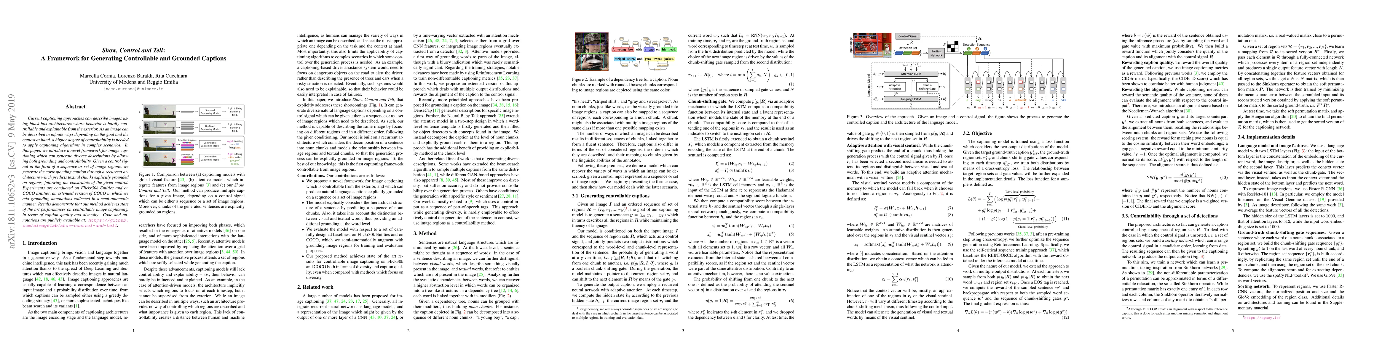 Current captioning approaches can describe images using black-box architectures whose behavior is hardly controllable and explainable from the exterior. As an image can be described in infinite ways depending on the goal and the context at hand, a higher degree of controllability is needed to apply captioning algorithms in complex scenarios. In this paper, we introduce a novel framework for image captioning which can generate diverse descriptions by allowing both grounding and controllability. Given a control signal in the form of a sequence or set of image regions, we generate the corresponding caption through a recurrent architecture which predicts textual chunks explicitly grounded on regions, following the constraints of the given control. Experiments are conducted on Flickr30k Entities and on COCO Entities, an extended version of COCO in which we add grounding annotations collected in a semi-automatic manner. Results demonstrate that our method achieves state of the art performances on controllable image captioning, in terms of caption quality and diversity. Code and annotations are publicly available at: https://github.com/aimagelab/show-control-and-tell.