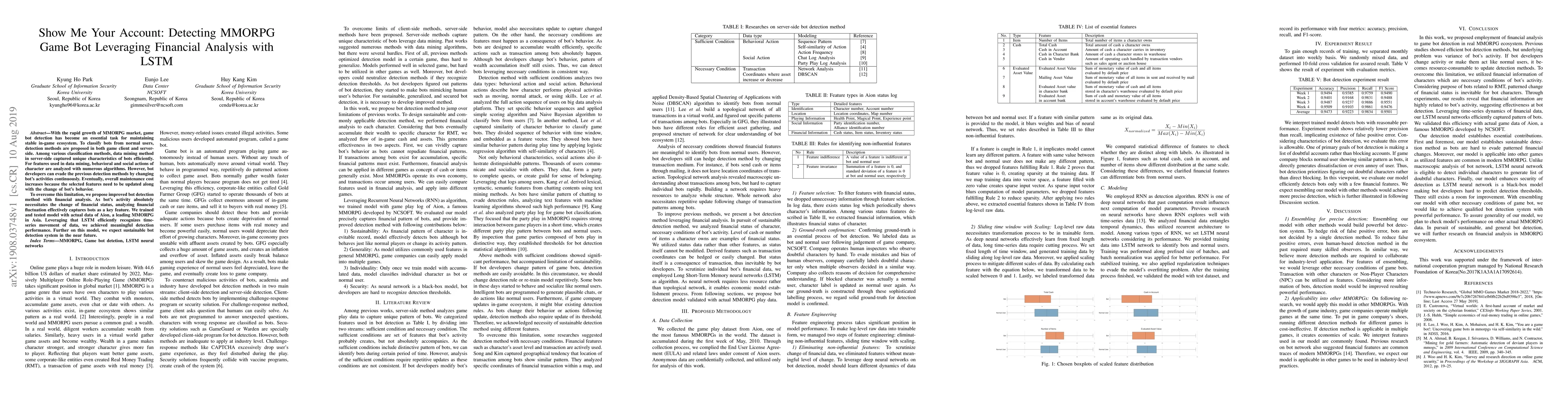 This paper proposes an improved bot detection method for MMORPGs using financial analysis and LSTM to identify bots based on financial status fluctuations. The LSTM model effectively captures time-series data, achieving better detection performance compared to traditional methods.