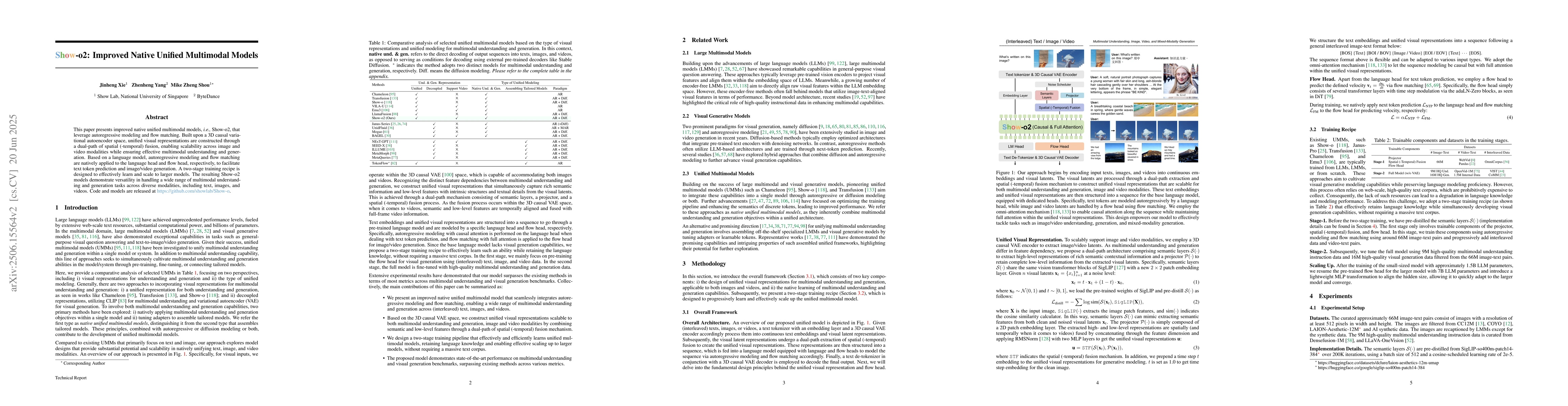 This paper presents improved native unified multimodal models, \emph{i.e.,} Show-o2, that leverage autoregressive modeling and flow matching. Built upon a 3D causal variational autoencoder space, unified visual representations are constructed through a dual-path of spatial (-temporal) fusion, enabling scalability across image and video modalities while ensuring effective multimodal understanding and generation. Based on a language model, autoregressive modeling and flow matching are natively applied to the language head and flow head, respectively, to facilitate text token prediction and image/video generation. A two-stage training recipe is designed to effectively learn and scale to larger models. The resulting Show-o2 models demonstrate versatility in handling a wide range of multimodal understanding and generation tasks across diverse modalities, including text, images, and videos. Code and models are released at https://github.com/showlab/Show-o.