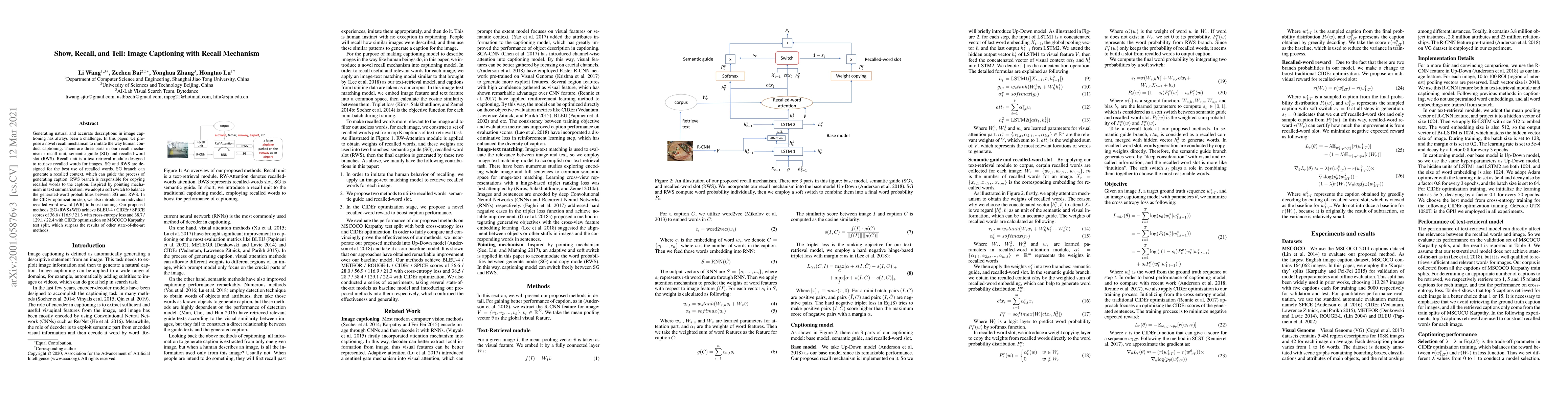 This paper proposes a novel recall mechanism for image captioning that mimics human captioning processes, consisting of a recall unit, semantic guide, and recalled-word slot. The method achieves superior performance in natural and accurate caption generation, outperforming other state-of-the-art techniques on the MSCOCO Karpathy test split.