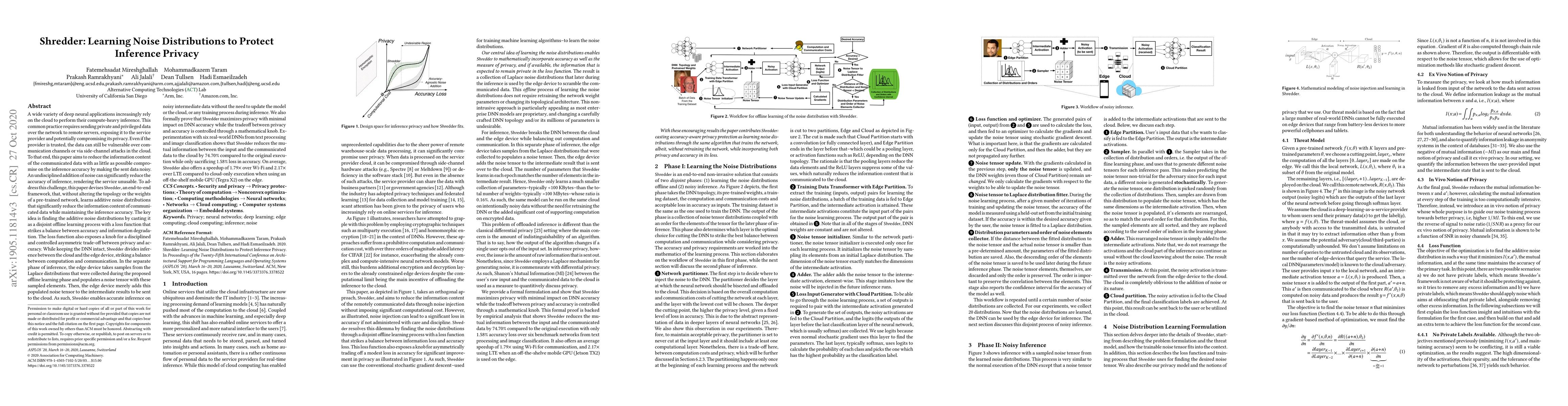 A wide variety of deep neural applications increasingly rely on the cloud to perform their compute-heavy inference. This common practice requires sending private and privileged data over the network to remote servers, exposing it to the service provider and potentially compromising its privacy. Even if the provider is trusted, the data can still be vulnerable over communication channels or via side-channel attacks in the cloud. To that end, this paper aims to reduce the information content of the communicated data with as little as possible compromise on the inference accuracy by making the sent data noisy. An undisciplined addition of noise can significantly reduce the accuracy of inference, rendering the service unusable. To address this challenge, this paper devises Shredder, an end-to-end framework, that, without altering the topology or the weights of a pre-trained network, learns additive noise distributions that significantly reduce the information content of communicated data while maintaining the inference accuracy. The key idea is finding the additive noise distributions by casting it as a disjoint offline learning process with a loss function that strikes a balance between accuracy and information degradation. The loss function also exposes a knob for a disciplined and controlled asymmetric trade-off between privacy and accuracy. Experimentation with six real-world DNNs from text processing and image classification shows that Shredder reduces the mutual information between the input and the communicated data to the cloud by 74.70% compared to the original execution while only sacrificing 1.58% loss in accuracy. On average, Shredder also offers a speedup of 1.79x over Wi-Fi and 2.17x over LTE compared to cloud-only execution when using an off-the-shelf mobile GPU (Tegra X2) on the edge.