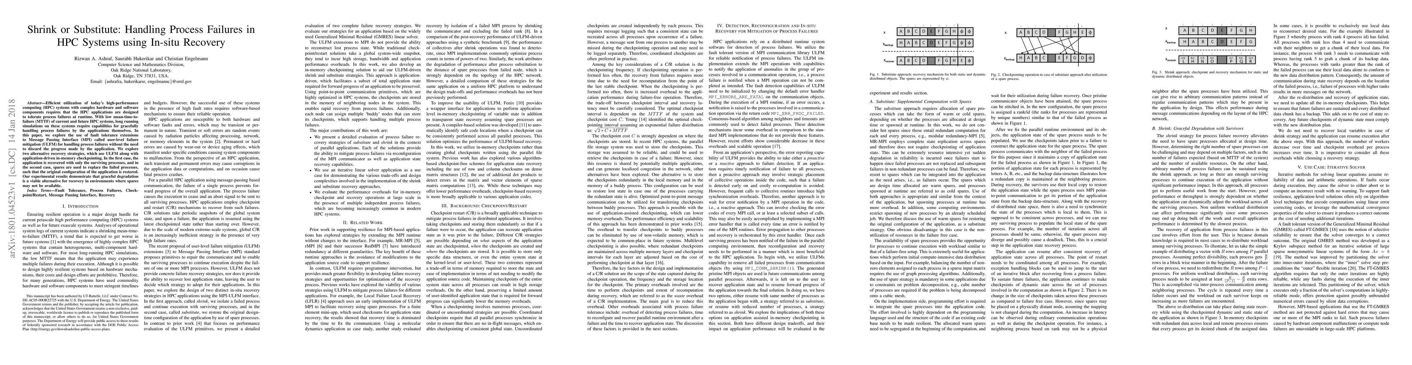 Efficient utilization of today's high-performance computing (HPC) systems with complex hardware and software components requires that the HPC applications are designed to tolerate process failures at runtime. With low mean time to failure (MTTF) of current and future HPC systems, long running simulations on these systems require capabilities for gracefully handling process failures by the applications themselves. In this paper, we explore the use of fault tolerance extensions to Message Passing Interface (MPI) called user-level failure mitigation (ULFM) for handling process failures without the need to discard the progress made by the application. We explore two alternative recovery strategies, which use ULFM along with application-driven in-memory checkpointing. In the first case, the application is recovered with only the surviving processes, and in the second case, spares are used to replace the failed processes, such that the original configuration of the application is restored. Our experimental results demonstrate that graceful degradation is a viable alternative for recovery in environments where spares may not be available.