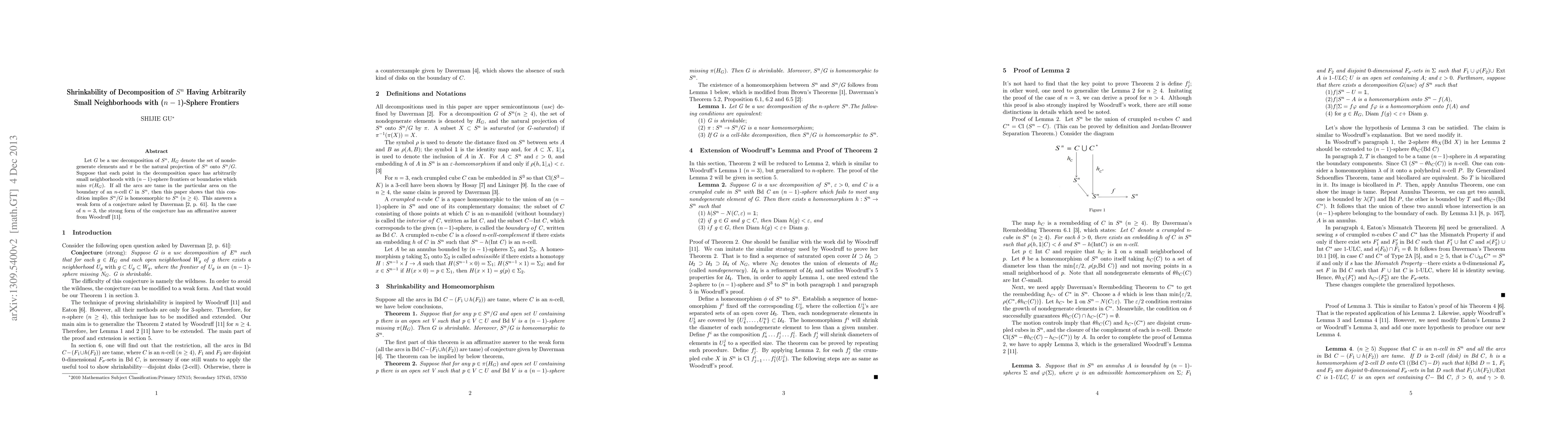 Let $G$ be a usc decomposition of $S^n$, $H_G$ denote the set of nondegenerate elements and $\pi$ be the natural projection of $S^n$ onto $S^n/G$. Suppose that each point in the decomposition space has arbitrarily small neighborhoods with ($n-1$)-sphere frontiers or boundaries which miss $\pi(H_G)$. If all the arcs are tame in the particular area on the boundary of an $n$-cell $C$ in $S^n$, then this paper shows that this condition implies $S^n/G$ is homeomorphic to $S^n$ ($n\geq 4$). This answers a weak form of a conjecture asked by Daverman [2, p. 61]. In the case of $n=3$, the strong form of the conjecture has an affirmative answer from Woodruff [11].