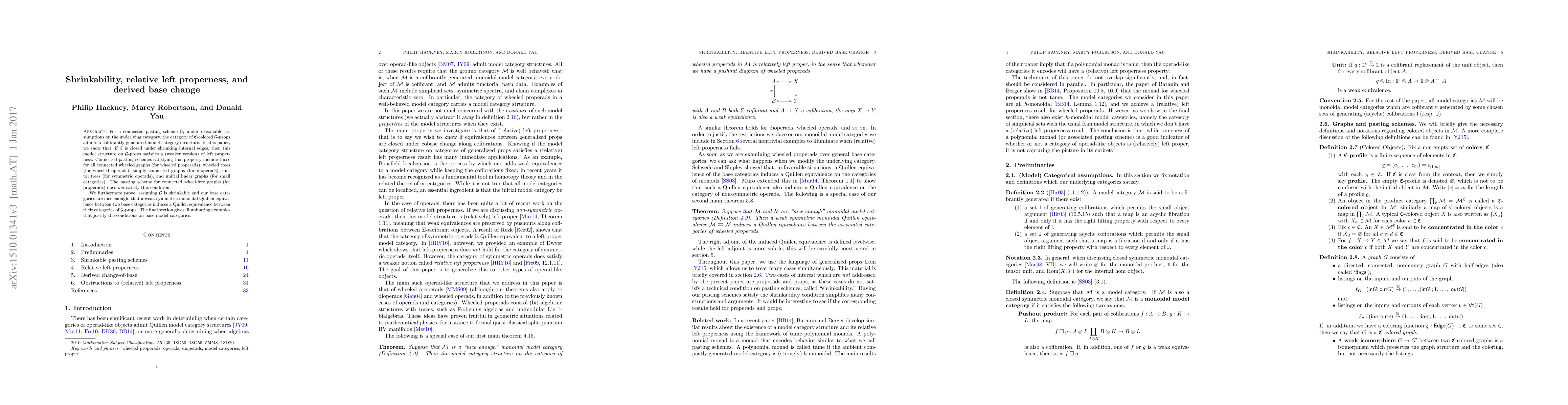 For a connected pasting scheme $\mathcal G$, under reasonable assumptions on the underlying category, the category of $\mathfrak C$-colored $\mathcal G$-props admits a cofibrantly generated model category structure. In this paper, we show that, if $\mathcal G$ is closed under shrinking internal edges, then this model structure on $\mathcal G$-props satisfies a (weaker version) of left properness. Connected pasting schemes satisfying this property include those for all connected wheeled graphs (for wheeled properads), wheeled trees (for wheeled operads), simply connected graphs (for dioperads), unital trees (for symmetric operads), and unitial linear graphs (for small categories). The pasting scheme for connected wheel-free graphs (for properads) does _not_ satisfy this condition. We furthermore prove, assuming $\mathcal G$ is shrinkable and our base categories are nice enough, that a weak symmetric monoidal Quillen equivalence between two base categories induces a Quillen equivalence between their categories of $\mathcal G$-props. The final section gives illuminating examples that justify the conditions on base model categories.