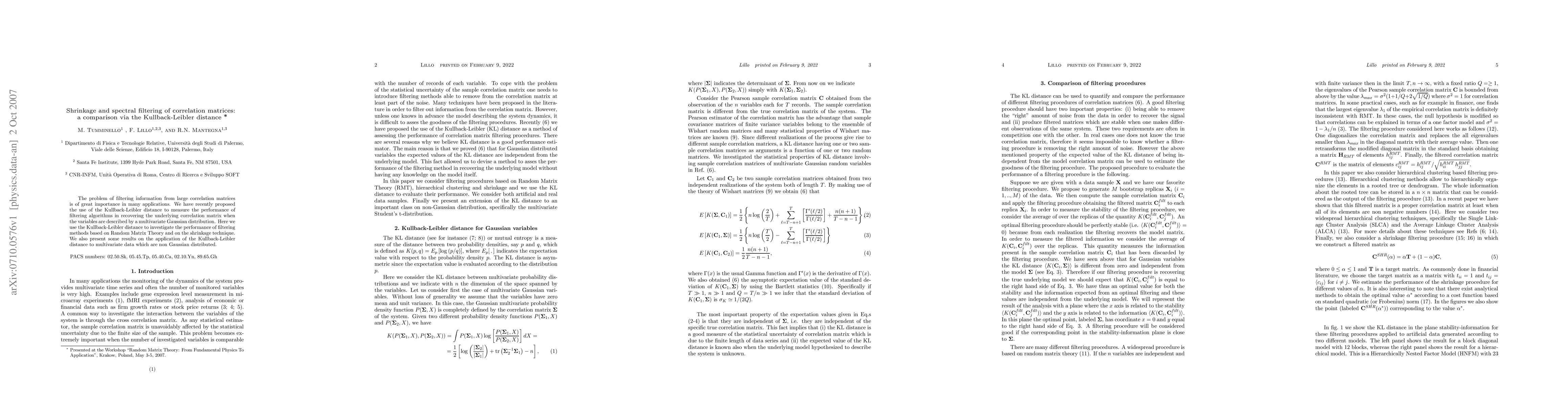 This paper explores the performance of filtering methods for large correlation matrices using the Kullback-Leibler distance, comparing Random Matrix Theory and shrinkage techniques, and also examines their applicability to non-Gaussian multivariate data.