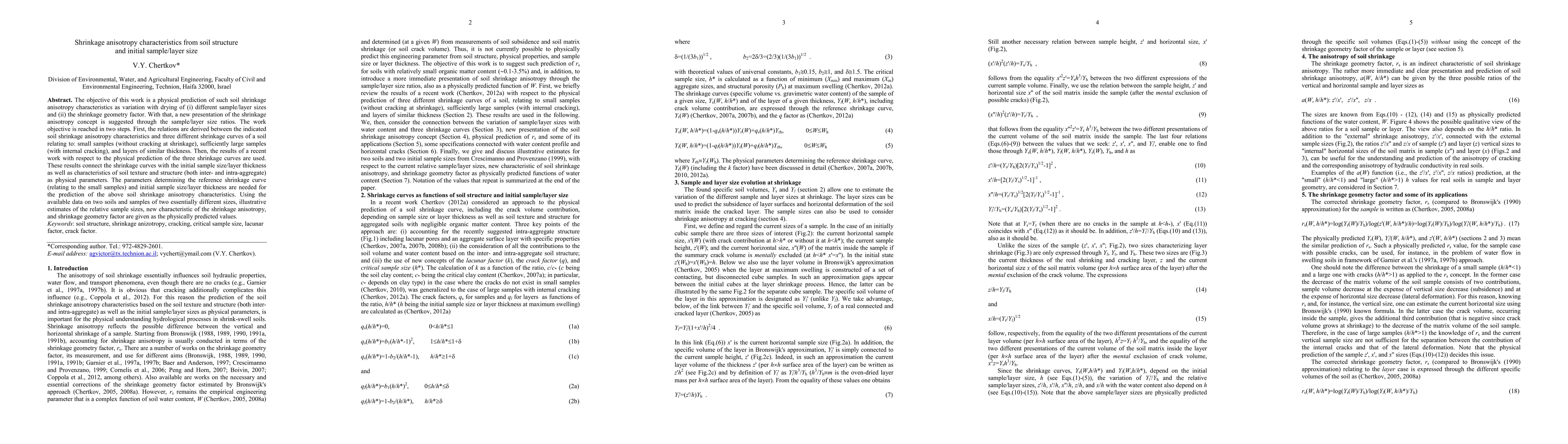 The objective of this work is a physical prediction of such soil shrinkage anisotropy characteristics as variation with drying of (i) different sample/layer sizes and (ii) the shrinkage geometry factor. With that, a new presentation of the shrinkage anisotropy concept is suggested through the sample/layer size ratios. The work objective is reached in two steps. First, the relations are derived between the indicated soil shrinkage anisotropy characteristics and three different shrinkage curves of a soil relating to: small samples (without cracking at shrinkage), sufficiently large samples (with internal cracking), and layers of similar thickness. Then, the results of a recent work with respect to the physical prediction of the three shrinkage curves are used. These results connect the shrinkage curves with the initial sample size/layer thickness as well as characteristics of soil texture and structure (both inter- and intra-aggregate) as physical parameters. The parameters determining the reference shrinkage curve (relating to the small samples) and initial sample size/layer thickness are needed for the prediction of the above soil shrinkage anisotropy characteristics. Using the available data on two soils and samples of two essentially different sizes, illustrative estimates of the relative sample sizes, new characteristic of the shrinkage anisotropy, and shrinkage geometry factor are given as the physically predicted values.