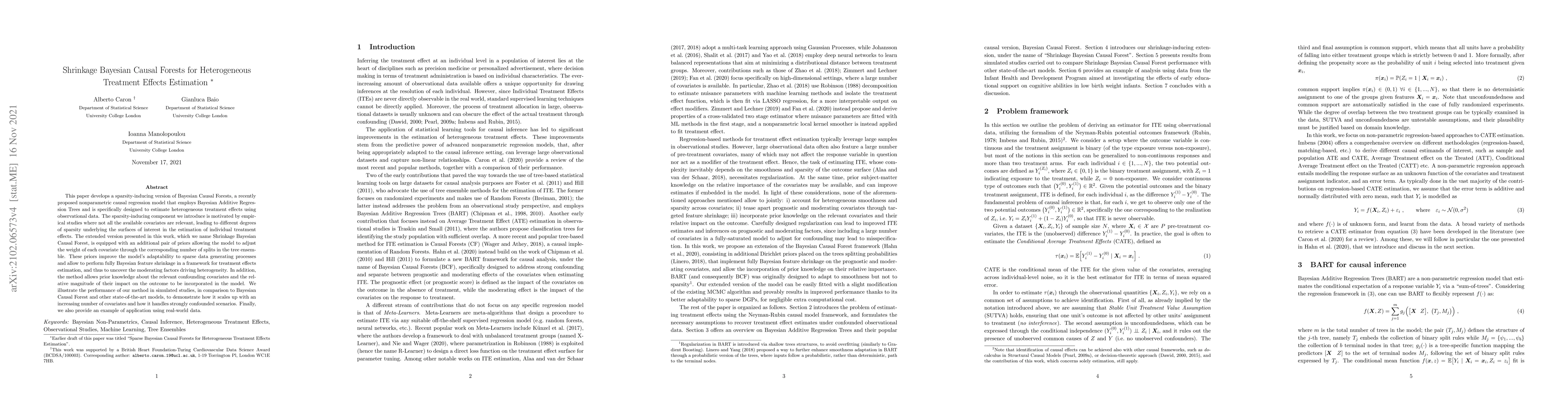 This paper introduces a sparsity-inducing version of Bayesian Causal Forests called Shrinkage Bayesian Causal Forest to estimate heterogeneous treatment effects. It incorporates priors to adjust covariate weights and enhance adaptability to sparse data, enabling feature shrinkage and uncovering moderating factors.