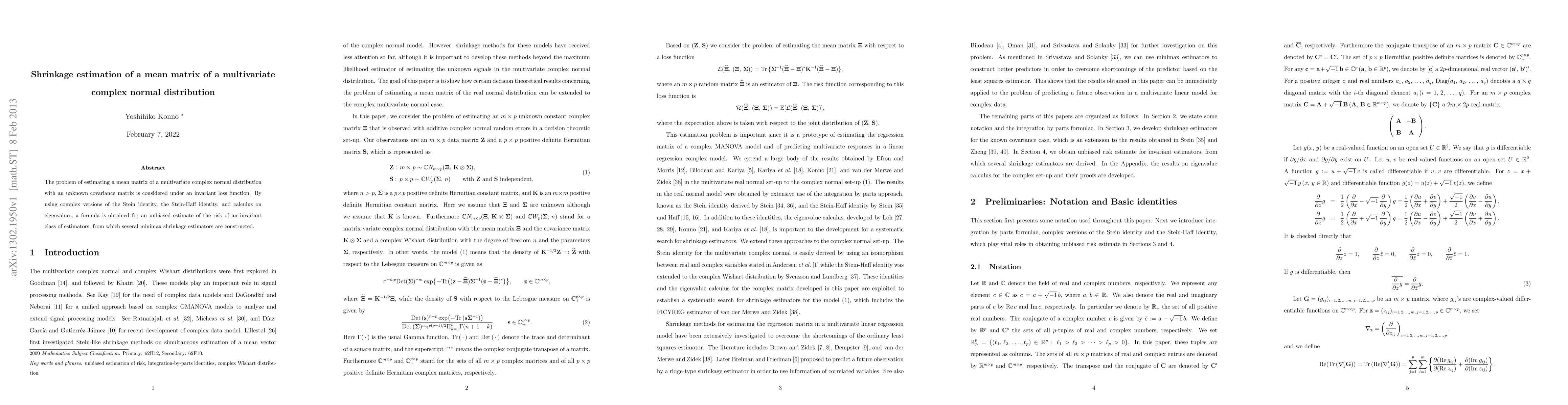 The paper develops invariant shrinkage estimators for the mean matrix of a multivariate complex normal distribution with unknown covariance, utilizing complex versions of the Stein and Stein-Haff identities to construct minimax shrinkage estimators that minimize risk.