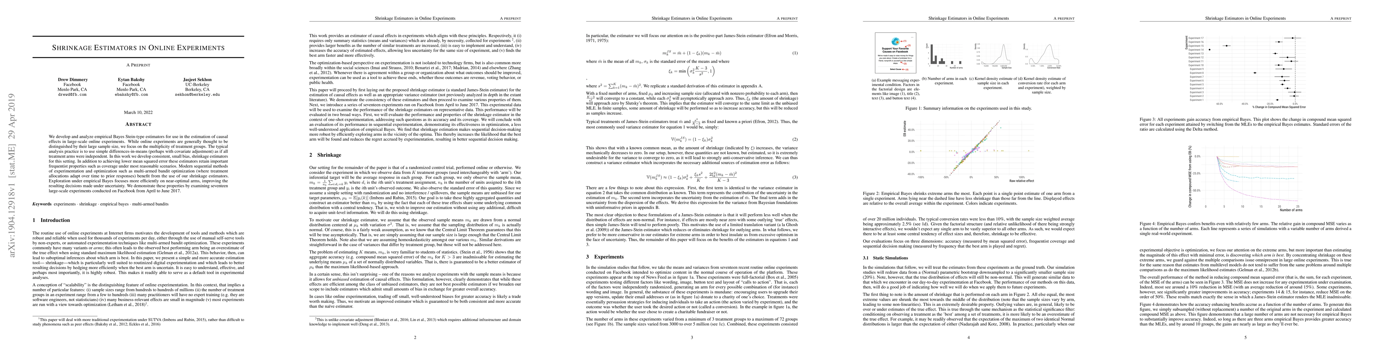 We develop and analyze empirical Bayes Stein-type estimators for use in the estimation of causal effects in large-scale online experiments. While online experiments are generally thought to be distinguished by their large sample size, we focus on the multiplicity of treatment groups. The typical analysis practice is to use simple differences-in-means (perhaps with covariate adjustment) as if all treatment arms were independent. In this work we develop consistent, small bias, shrinkage estimators for this setting. In addition to achieving lower mean squared error these estimators retain important frequentist properties such as coverage under most reasonable scenarios. Modern sequential methods of experimentation and optimization such as multi-armed bandit optimization (where treatment allocations adapt over time to prior responses) benefit from the use of our shrinkage estimators. Exploration under empirical Bayes focuses more efficiently on near-optimal arms, improving the resulting decisions made under uncertainty. We demonstrate these properties by examining seventeen large-scale experiments conducted on Facebook from April to June 2017.
