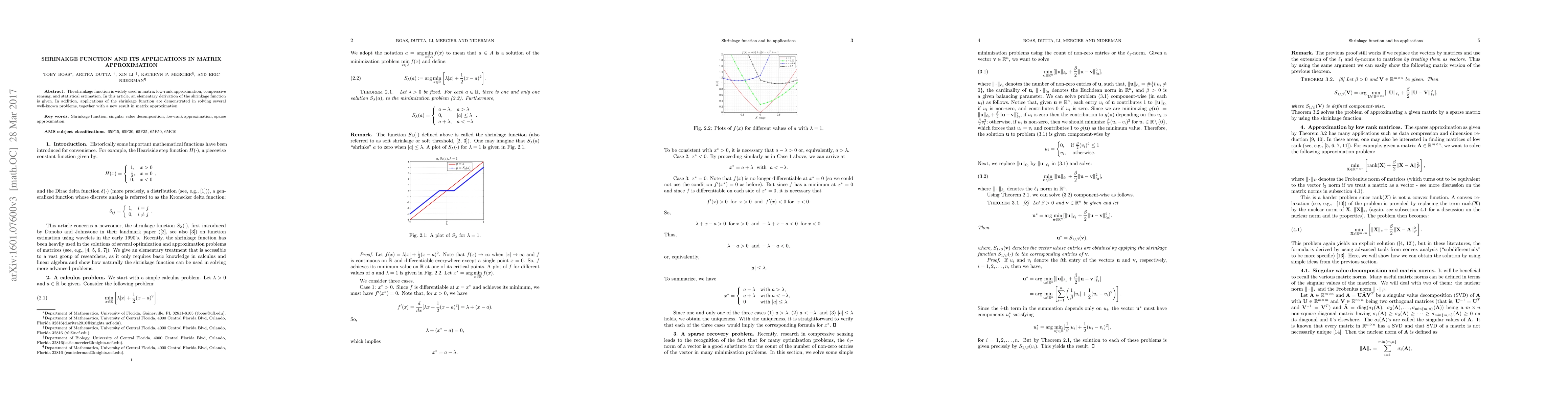 This paper derives the shrinkage function and explores its applications in matrix approximation, compressive sensing, and statistical estimation, presenting a new result in matrix approximation alongside solving several well-known problems.