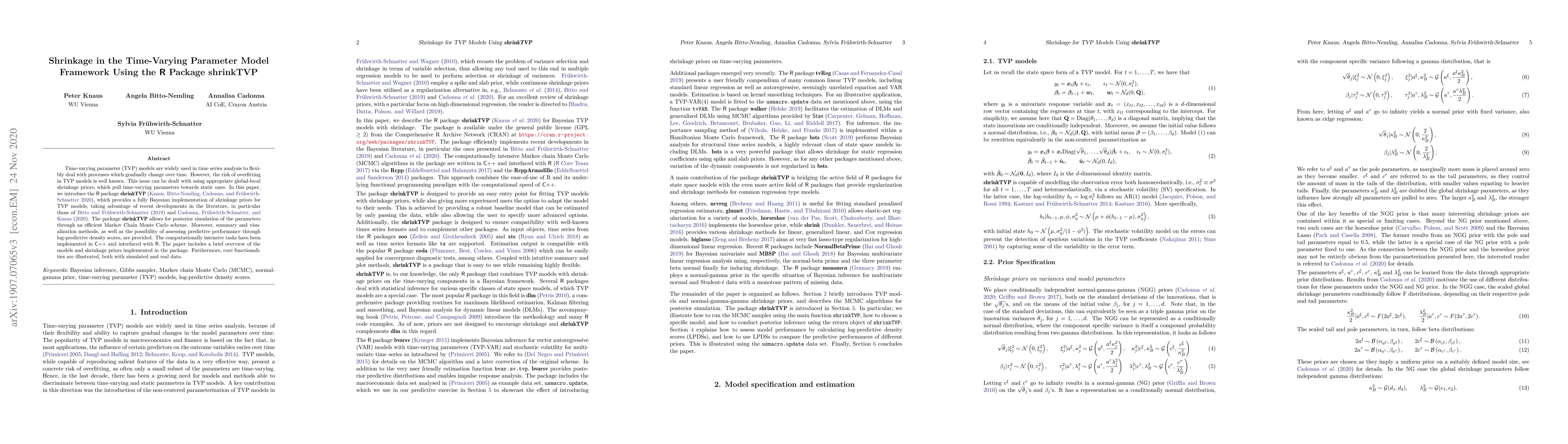 This paper introduces the R package shrinkTVP for implementing shrinkage priors in time-varying parameter (TVP) models to mitigate overfitting, utilizing efficient MCMC methods and C++ for computational tasks. It includes posterior simulation, summary, visualization, and predictive performance assessment features.