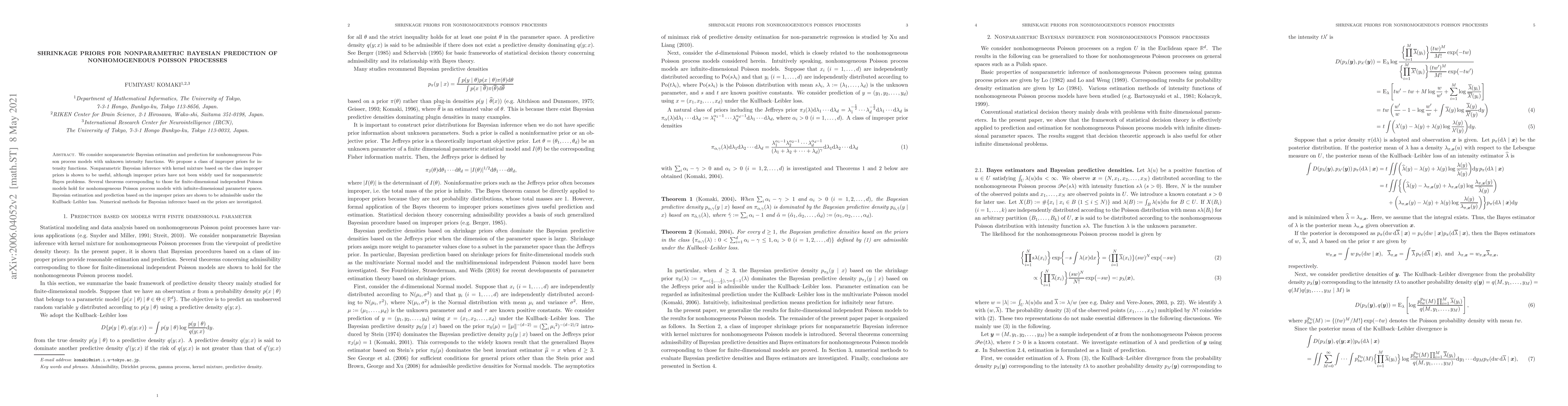 This paper proposes improper priors for nonparametric Bayesian estimation and prediction of nonhomogeneous Poisson processes with unknown intensity functions. It demonstrates that kernel mixture-based inference using these priors is effective and admissible under Kullback-Leibler loss, extending finite-dimensional results to infinite-dimensional parameter spaces.