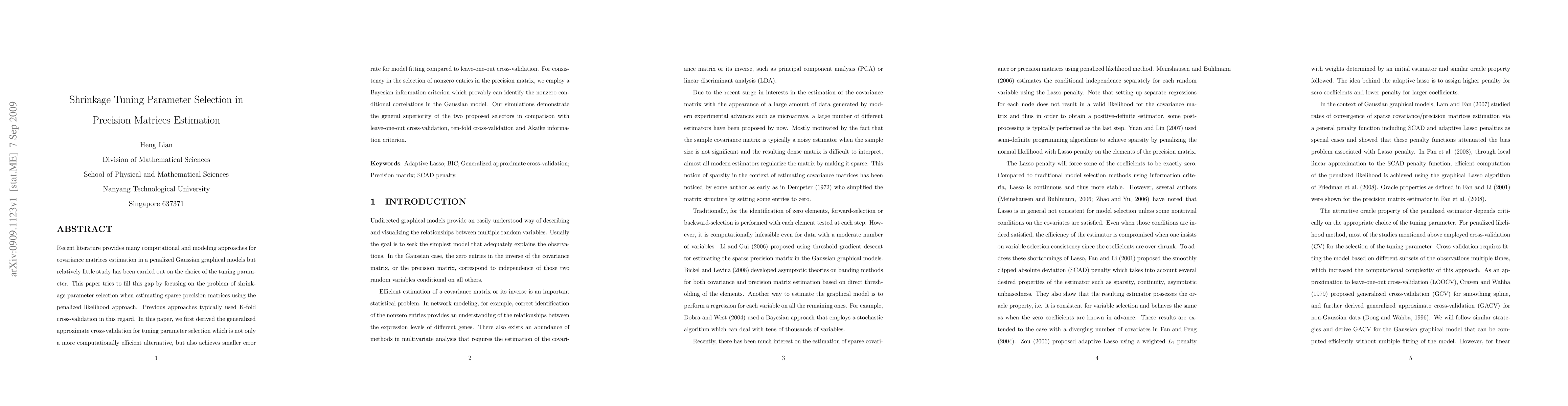 This paper proposes generalized approximate cross-validation and a Bayesian information criterion for selecting shrinkage parameters in estimating sparse precision matrices, demonstrating superior performance over traditional cross-validation methods and the Akaike information criterion in simulations.