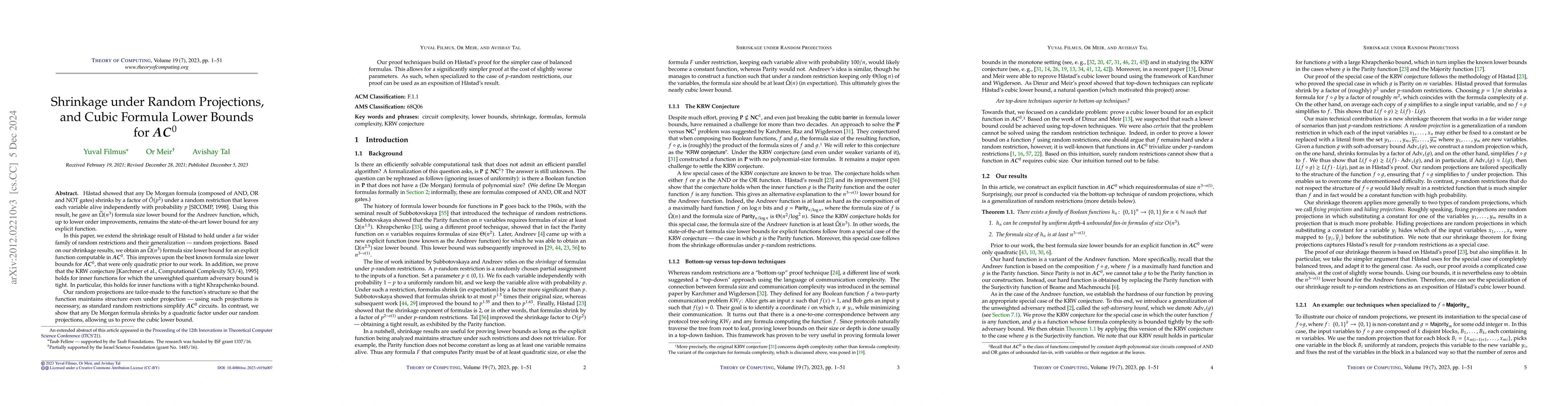 H\r{a}stad showed that any De Morgan formula (composed of AND, OR and NOT gates) shrinks by a factor of $O(p^{2})$ under a random restriction that leaves each variable alive independently with probability $p$ [SICOMP, 1998]. Using this result, he gave an $\widetilde{\Omega}(n^{3})$ formula size lower bound for the Andreev function, which, up to lower order improvements, remains the state-of-the-art lower bound for any explicit function. In this work, we extend the shrinkage result of H\r{a}stad to hold under a far wider family of random restrictions and their generalization -- random projections. Based on our shrinkage results, we obtain an $\widetilde{\Omega}(n^{3})$ formula size lower bound for an explicit function computed in $\mathbf{AC}^0$. This improves upon the best known formula size lower bounds for $\mathbf{AC}^0$, that were only quadratic prior to our work. In addition, we prove that the KRW conjecture [Karchmer et al., Computational Complexity 5(3/4), 1995] holds for inner functions for which the unweighted quantum adversary bound is tight. In particular, this holds for inner functions with a tight Khrapchenko bound. Our random projections are tailor-made to the function's structure so that the function maintains structure even under projection -- using such projections is necessary, as standard random restrictions simplify $\mathbf{AC}^0$ circuits. In contrast, we show that any De Morgan formula shrinks by a quadratic factor under our random projections, allowing us to prove the cubic lower bound. Our proof techniques build on the proof of H\r{a}stad for the simpler case of balanced formulas. This allows for a significantly simpler proof at the cost of slightly worse parameters. As such, when specialized to the case of $p$-random restrictions, our proof can be used as an exposition of H\r{a}stad's result.