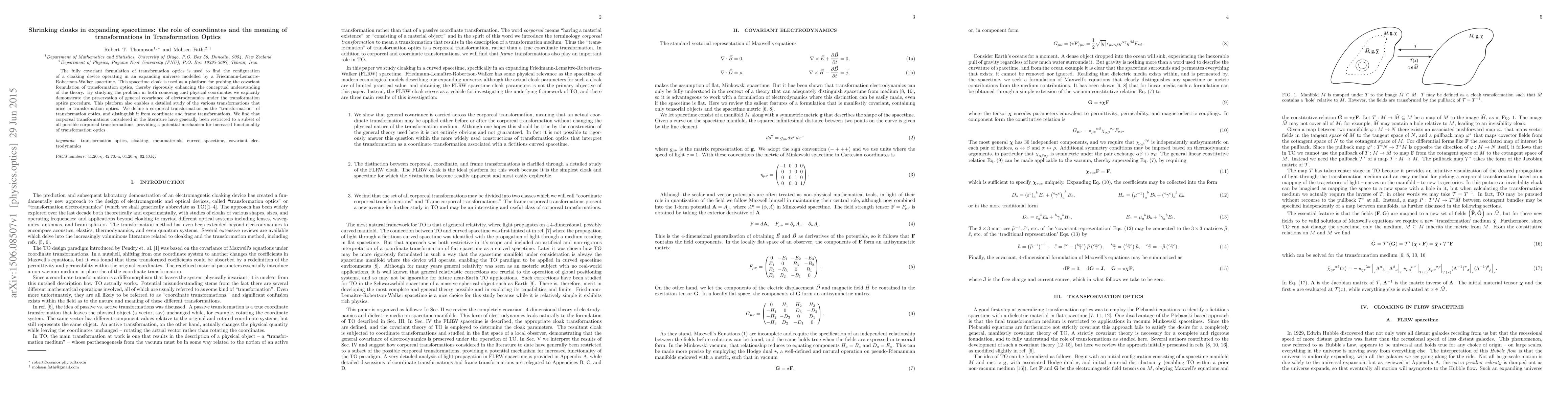 The fully covariant formulation of transformation optics is used to find the configuration of a cloaking device operating in an expanding universe modelled by a Friedmann-Lema\^itre-Robertson-Walker spacetime. This spacetime cloak is used as a platform for probing the covariant formulation of transformation optics, thereby rigorously enhancing the conceptual understanding of the theory. By studying the problem in both comoving and physical coordinates we explicitly demonstrate the preservation of general covariance of electrodynamics under the transformation optics procedure. This platform also enables a detailed study of the various transformations that arise in transformation optics. We define a corporeal transformation as the "transformation" of transformation optics, and distinguish it from coordinate and frame transformations. We find that corporeal transformations considered in the literature have generally been restricted to a subset of all possible corporeal transformations, providing a potential mechanism for increased functionality of transformation optics.