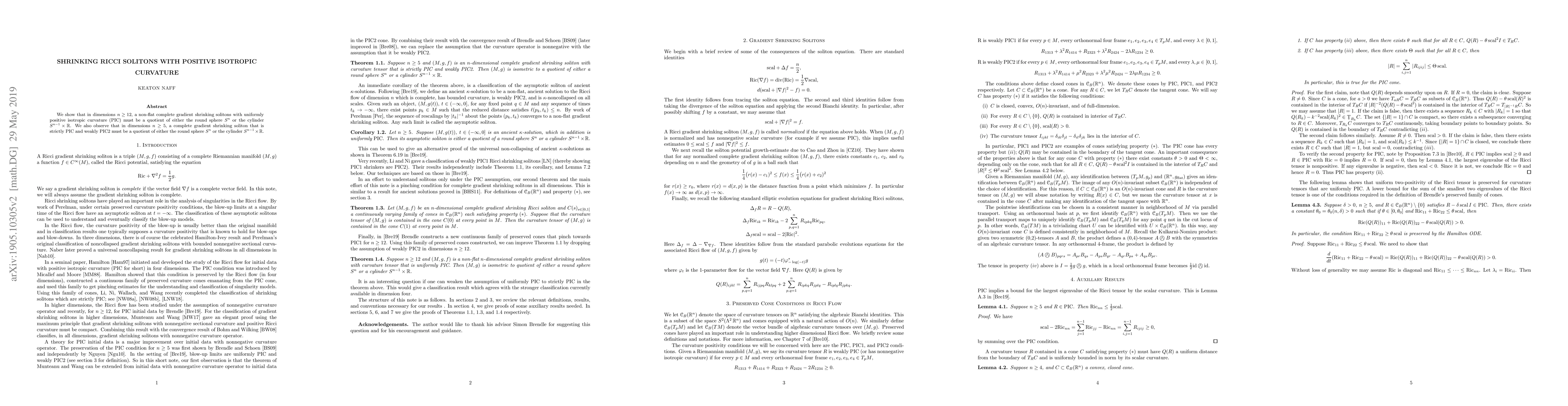 We show that in dimensions $n \geq 12$, a non-flat complete gradient shrinking solitons with uniformly positive isotropic curvature (PIC) must be a quotient of either the round sphere $S^n$ or the cylinder $S^{n-1} \times \mathbb{R}$. We also observe that in dimensions $n \geq 5$, a complete gradient shrinking soliton that is strictly PIC and weakly PIC2 must be a quotient of either the round sphere $S^n$ or the cylinder $S^{n-1} \times \mathbb{R}$.