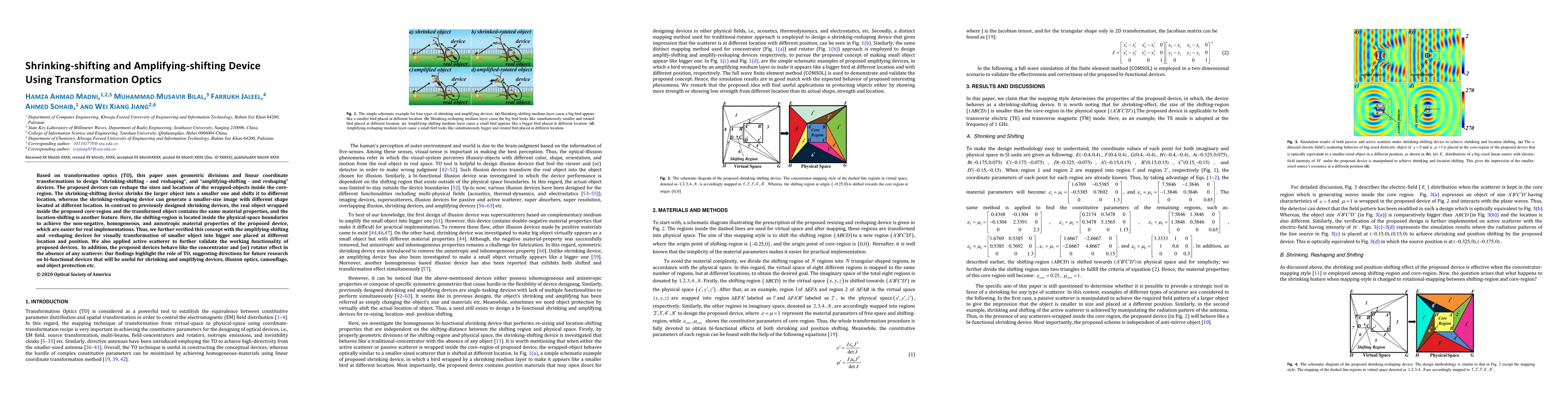 Based on transformation optics (TO), this paper uses geometric divisions and linear coordinate transformations to design shrinking-shifting - and reshaping, and amplifying-shifting - and reshaping devices. The proposed devices can reshape the sizes and locations of the wrapped-objects inside the core-region. The shrinking-shifting device shrinks the larger object into a smaller one and shifts it to different location, whereas the shrinking-reshaping device can generate a smaller-size image with different shape located at different location. In contrast to previously designed shrinking devices, the real object wrapped inside the proposed core-region and the transformed object contains the same material properties, and the location-shifting is another feature. Here, the shifting-region is located inside the physical-space boundaries to achieve the non-negative, homogeneous, and anisotropic material properties of the proposed device, which are easier for real implementations. Thus, we further verified this concept with the amplifying-shifting and -reshaping devices for visually transformation of smaller object into bigger one placed at different location and position. We also applied active scatterer to further validate the working functionality of proposed devices. In addition, the proposed devices behave like the concentrator and or rotator effect in the absence of any scatterer. Our findings highlight the role of TO, suggesting directions for future research on bi-functional devices that will be useful for shrinking and amplifying devices, illusion optics, camouflage, and object protection etc. Keywords: amplifying, reshaping, shrinking, transformation optics, invisibility cloaks