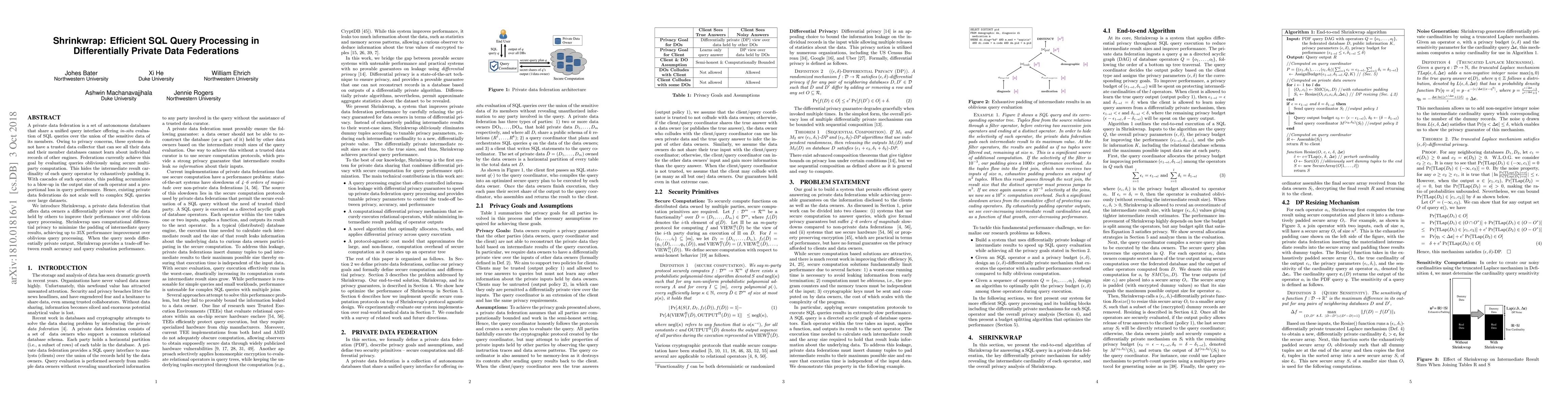 Shrinkwrap introduces a differentially private query processing method for private data federations, significantly improving performance over traditional oblivious query evaluation by minimizing intermediate result padding, achieving up to 35X improvement. It offers a trade-off between result accuracy and performance for differentially private outputs.