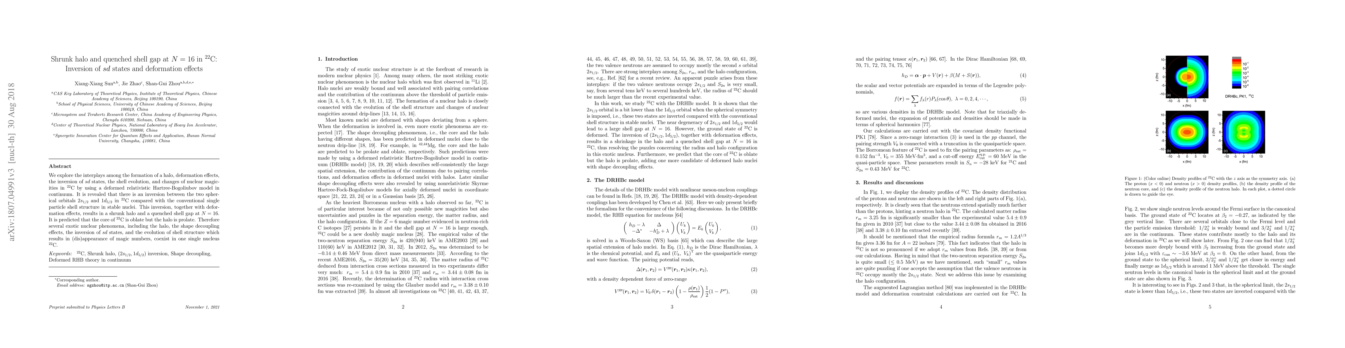 This research explores the ground state properties of $^{22}$C using a relativistic Hartree-Bogoliubov model, revealing an inversion of $sd$ states and deformation effects that lead to a shrunk halo and a quenched shell gap at $N=16$. The study predicts an oblate core and a prolate halo, highlighting the coexistence of exotic nuclear phenomena in $^{22}$C.