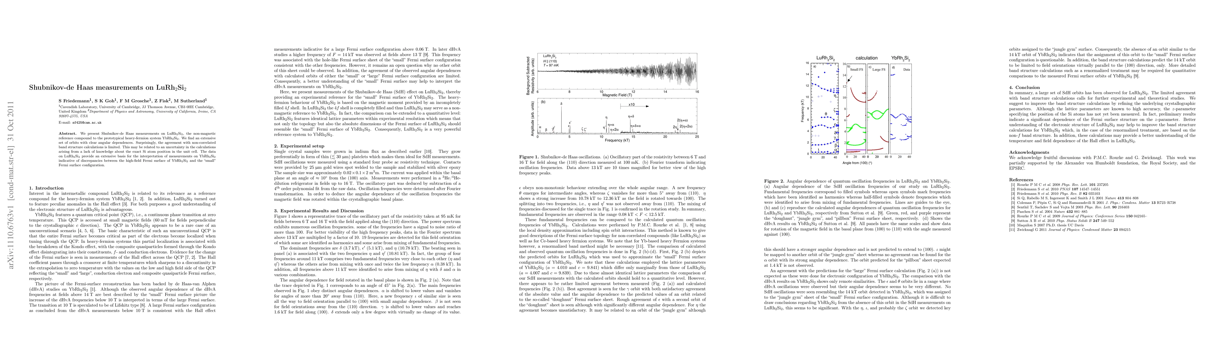 Researchers measured Shubnikov-de Haas effects in LuRh2Si2, a non-magnetic compound similar to YbRh2Si2, finding extensive orbits with angular dependences that don't match calculations based on the band structure. This suggests discrepancies between the two compounds' Fermi surfaces.