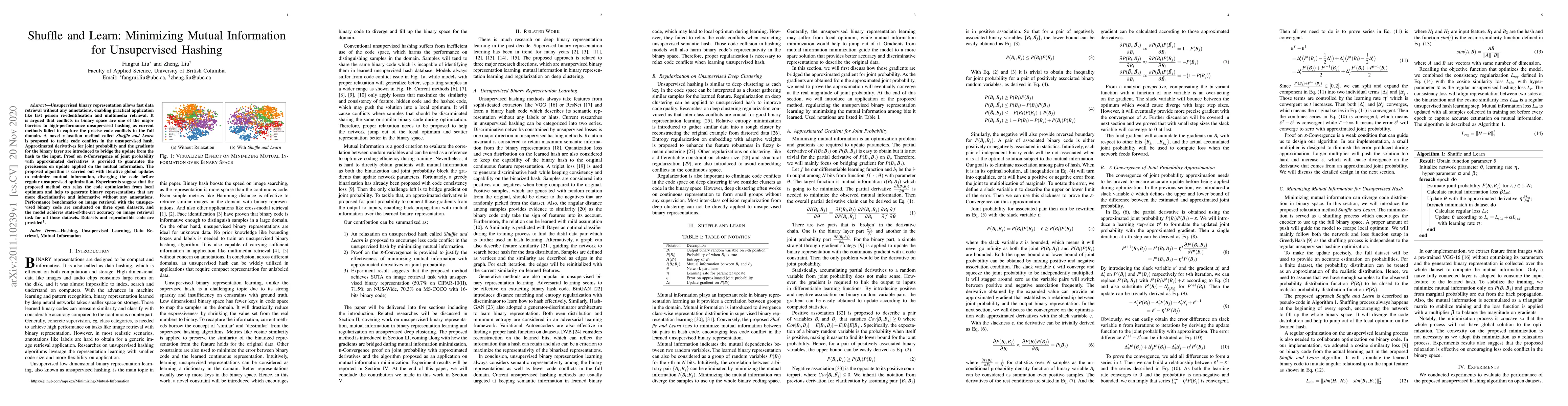 Unsupervised binary representation allows fast data retrieval without any annotations, enabling practical application like fast person re-identification and multimedia retrieval. It is argued that conflicts in binary space are one of the major barriers to high-performance unsupervised hashing as current methods failed to capture the precise code conflicts in the full domain. A novel relaxation method called Shuffle and Learn is proposed to tackle code conflicts in the unsupervised hash. Approximated derivatives for joint probability and the gradients for the binary layer are introduced to bridge the update from the hash to the input. Proof on $\epsilon$-Convergence of joint probability with approximated derivatives is provided to guarantee the preciseness on update applied on the mutual information. The proposed algorithm is carried out with iterative global updates to minimize mutual information, diverging the code before regular unsupervised optimization. Experiments suggest that the proposed method can relax the code optimization from local optimum and help to generate binary representations that are more discriminative and informative without any annotations. Performance benchmarks on image retrieval with the unsupervised binary code are conducted on three open datasets, and the model achieves state-of-the-art accuracy on image retrieval task for all those datasets. Datasets and reproducible code are provided.