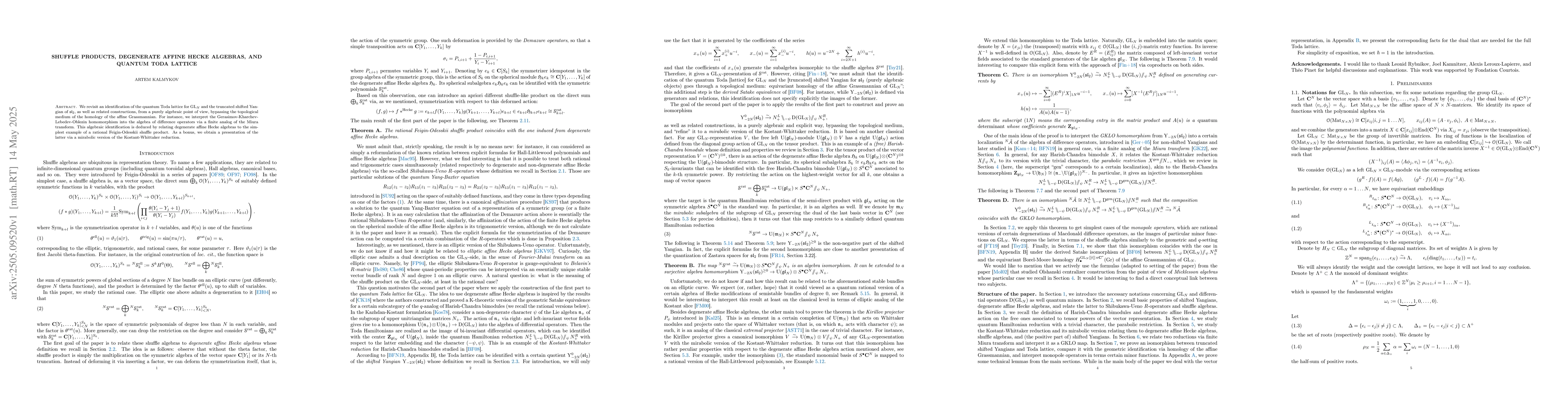 The paper presents an algebraic identification of quantum Toda lattice and shifted Yangian, interpreting homomorphisms through a Miura transform, and linking degenerate affine Hecke algebras to shuffle products via mirabolic Kostant-Whittaker reduction.