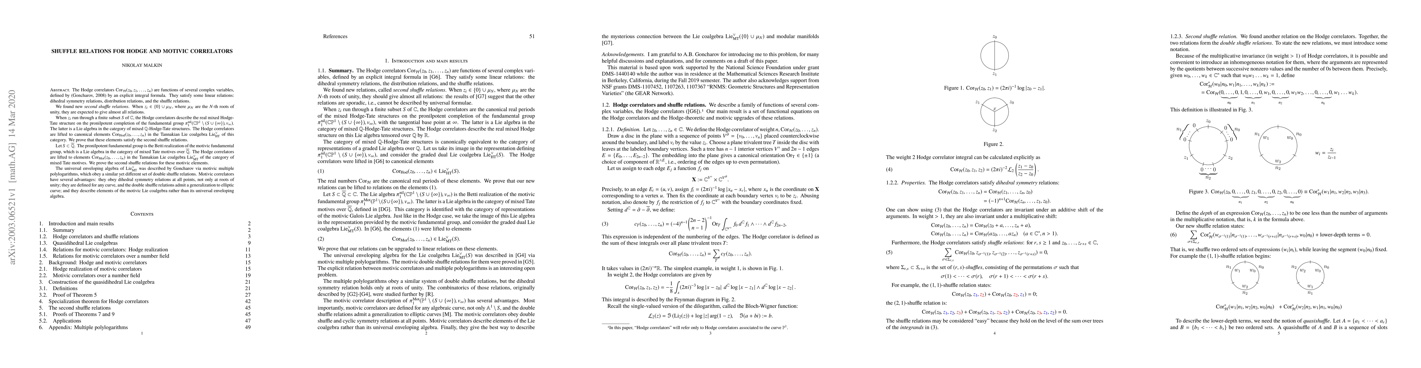 The Hodge correlators ${\rm Cor}_{\mathcal H}(z_0,z_1,\dots,z_n)$ are functions of several complex variables, defined by Goncharov (arXiv:0803.0297) by an explicit integral formula. They satisfy some linear relations: dihedral symmetry relations, distribution relations, and shuffle relations. We found new second shuffle relations. When $z_i\in0\cup\mu_N$, where $\mu_N$ are the $N$-th roots of unity, they are expected to give almost all relations. When $z_i$ run through a finite subset $S$ of $\mathbb C$, the Hodge correlators describe the real mixed Hodge-Tate structure on the pronilpotent completion of the fundamental group $\pi_1^{\rm nil}(\mathbb{CP}^1-(S\cup\infty),v_\infty)$, a Lie algebra in the category of mixed $\mathbb Q$-Hodge-Tate structures. The Hodge correlators are lifted to canonical elements ${\rm Cor_{Hod}}(z_0,\dots,z_n)$ in the Tannakian Lie coalgebra of this category. We prove that these elements satisfy the second shuffle relations. Let $S\subset\overline{\mathbb Q}$. The pronilpotent fundamental group is the Betti realization of the motivic fundamental group, a Lie algebra in the category of mixed Tate motives over $\overline{\mathbb Q}$. The Hodge correlators are lifted to elements ${\rm Cor_{Mot}}(z_0,\dots,z_n)$ in its Tannakian Lie coalgebra $\rm Lie_{MT}^\vee$. We prove the second shuffle relations for these motivic elements. The universal enveloping algebra of $\rm Lie_{MT}^\vee$ was described by Goncharov via motivic multiple polylogarithms, which obey a similar yet different set of double shuffle relations. Motivic correlators have several advantages: they obey dihedral symmetry relations at all points, not only at roots of unity; they are defined for any curve, and the double shuffle relations admit a generalization to elliptic curves; and they describe elements of the motivic Lie coalgebra rather than its universal enveloping algebra.