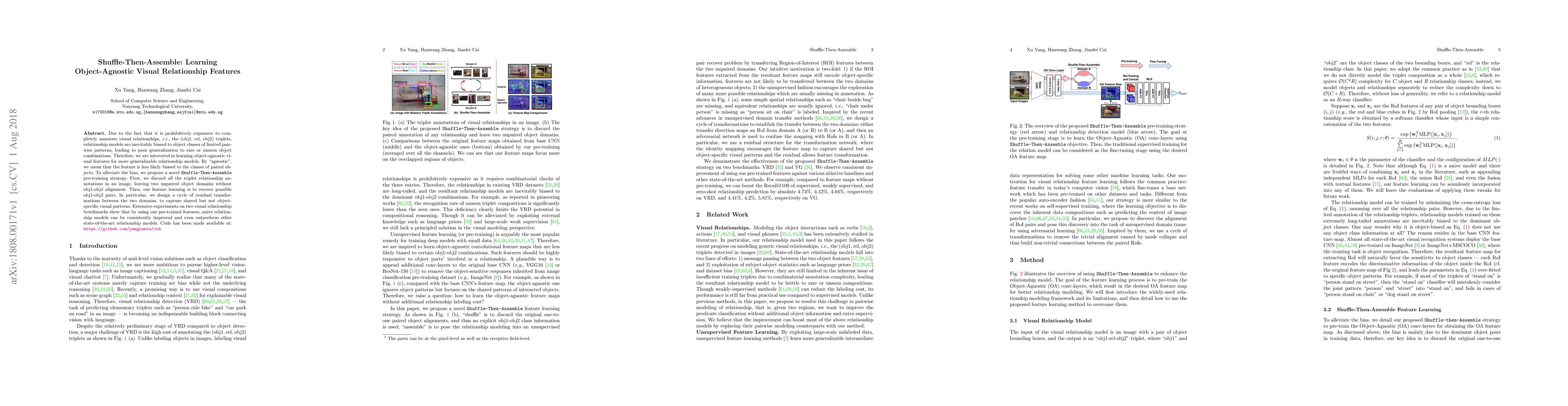 Due to the fact that it is prohibitively expensive to completely annotate visual relationships, i.e., the (obj1, rel, obj2) triplets, relationship models are inevitably biased to object classes of limited pairwise patterns, leading to poor generalization to rare or unseen object combinations. Therefore, we are interested in learning object-agnostic visual features for more generalizable relationship models. By "agnostic", we mean that the feature is less likely biased to the classes of paired objects. To alleviate the bias, we propose a novel \texttt{Shuffle-Then-Assemble} pre-training strategy. First, we discard all the triplet relationship annotations in an image, leaving two unpaired object domains without obj1-obj2 alignment. Then, our feature learning is to recover possible obj1-obj2 pairs. In particular, we design a cycle of residual transformations between the two domains, to capture shared but not object-specific visual patterns. Extensive experiments on two visual relationship benchmarks show that by using our pre-trained features, naive relationship models can be consistently improved and even outperform other state-of-the-art relationship models. Code has been made available at: \url{https://github.com/yangxuntu/vrd}.