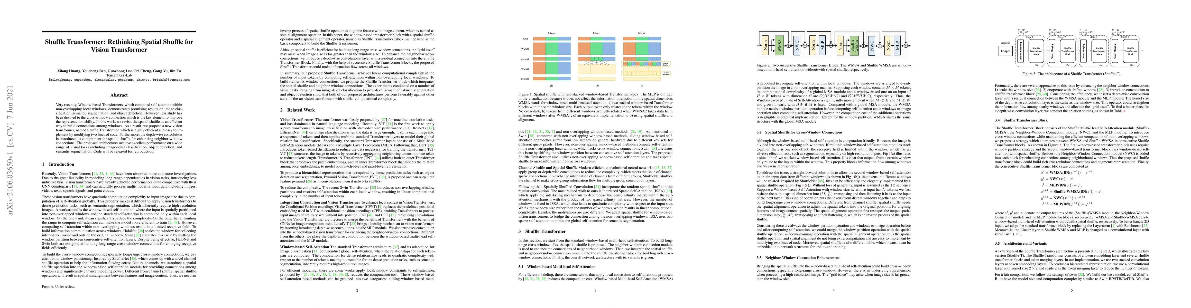 The Shuffle Transformer proposes an efficient spatial shuffle method to enhance connections between local windows in Vision Transformers, achieving superior performance on various visual tasks. The approach is simple to implement and is complemented by depth-wise convolution for better neighbor-window interactions.