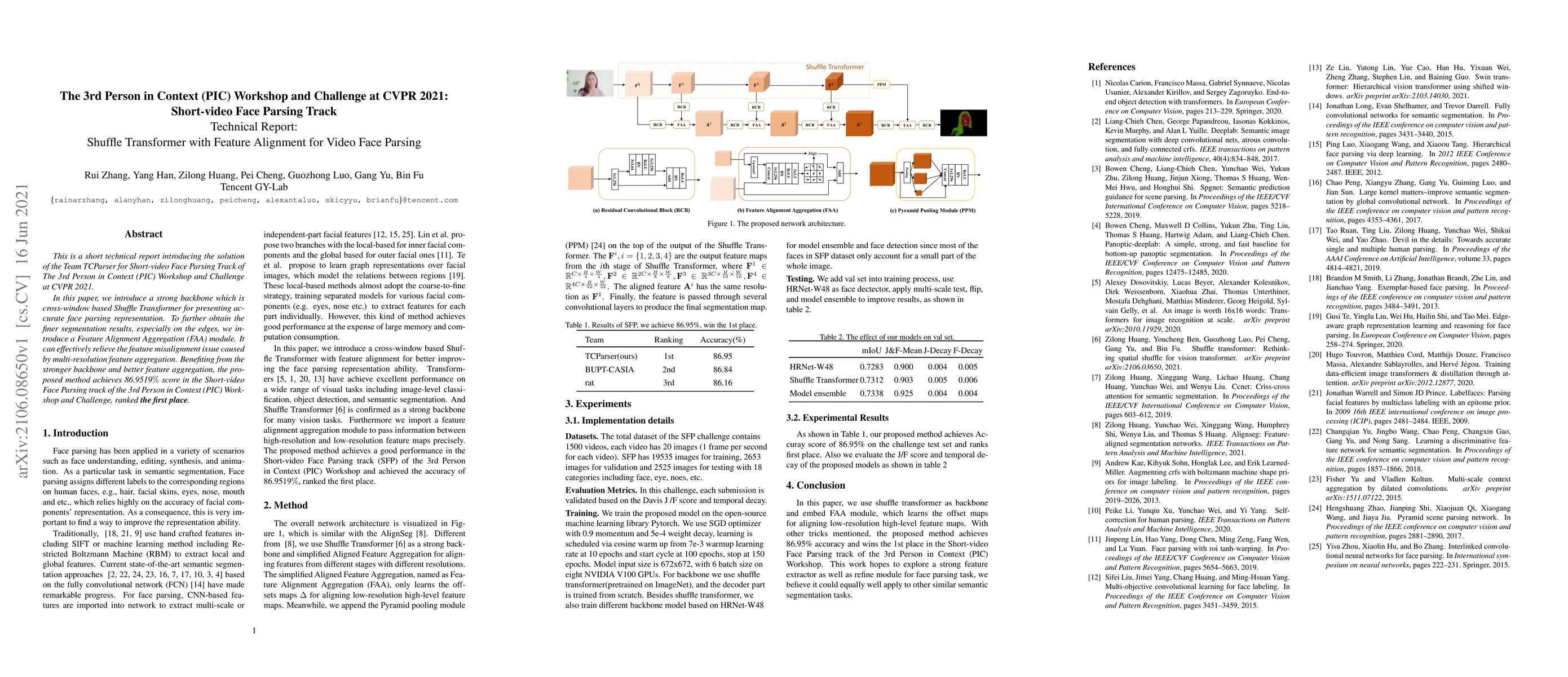 This paper presents a Shuffle Transformer with a Feature Alignment Aggregation module for accurate short-video face parsing, achieving a top score of 86.9519% and first place in the PIC Workshop and Challenge at CVPR 2021. The method effectively addresses feature misalignment issues for better segmentation results.