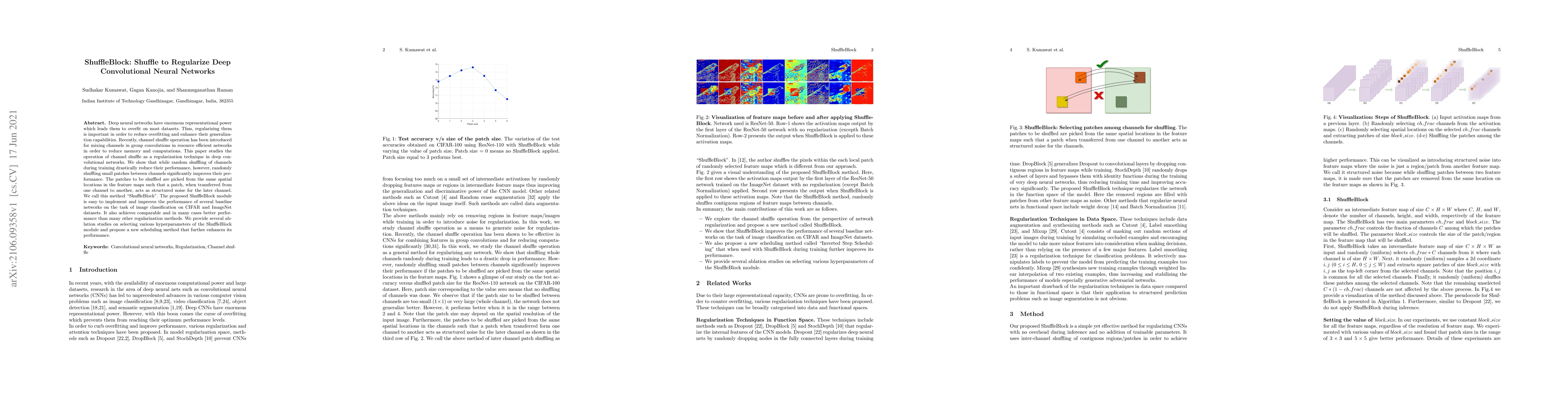 A new regularization technique called ShuffleBlock improves deep convolutional neural network performance on image classification tasks by randomly shuffling small patches between channels, reducing overfitting and enhancing generalization capabilities.