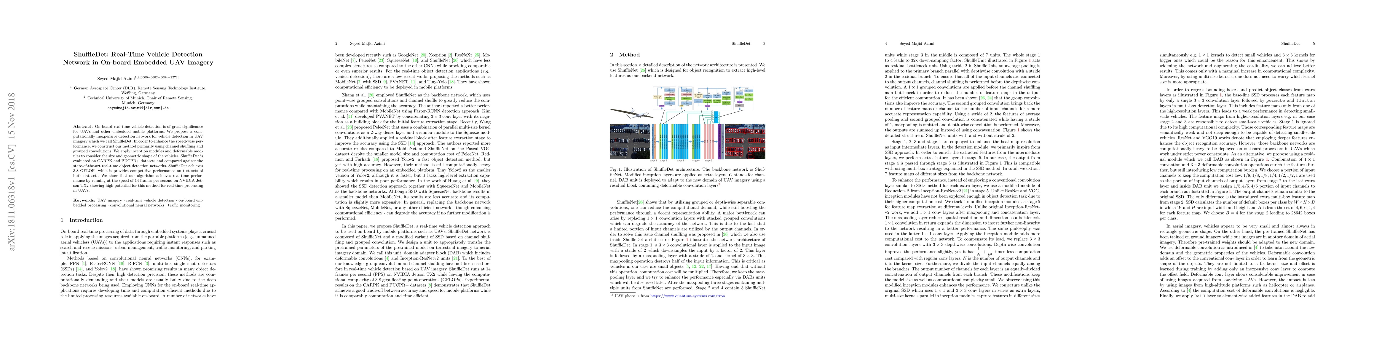 ShuffleDet is a lightweight real-time vehicle detection network for on-board UAV embedded systems, utilizing channel shuffling and grouped convolutions for speed. It achieves 14 frames per second on NVIDIA Jetson TX2, demonstrating competitive performance against state-of-the-art methods.