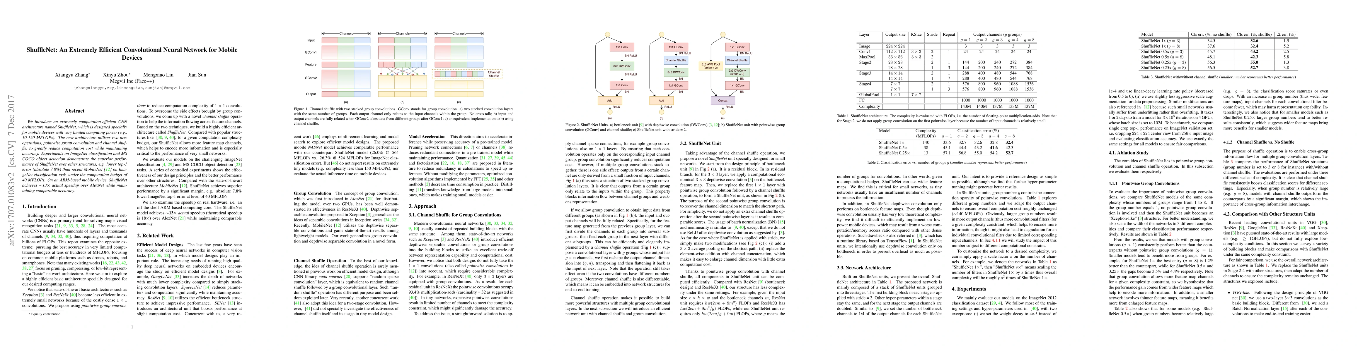 We introduce an extremely computation-efficient CNN architecture named ShuffleNet, which is designed specially for mobile devices with very limited computing power (e.g., 10-150 MFLOPs). The new architecture utilizes two new operations, pointwise group convolution and channel shuffle, to greatly reduce computation cost while maintaining accuracy. Experiments on ImageNet classification and MS COCO object detection demonstrate the superior performance of ShuffleNet over other structures, e.g. lower top-1 error (absolute 7.8%) than recent MobileNet on ImageNet classification task, under the computation budget of 40 MFLOPs. On an ARM-based mobile device, ShuffleNet achieves ~13x actual speedup over AlexNet while maintaining comparable accuracy.