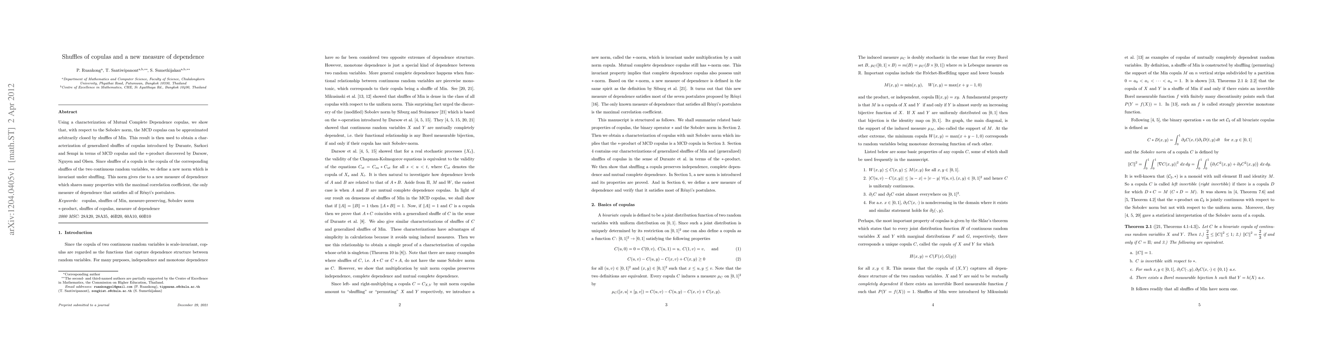 Using a characterization of Mutual Complete Dependence copulas, we show that, with respect to the Sobolev norm, the MCD copulas can be approximated arbitrarily closed by shuffles of Min. This result is then used to obtain a characterization of generalized shuffles of copulas introduced by Durante, Sarkoci and Sempi in terms of MCD copulas and the $\star$-product discovered by Darsow, Nguyen and Olsen. Since shuffles of a copula is the copula of the corresponding shuffles of the two continuous random variables, we define a new norm which is invariant under shuffling. This norm gives rise to a new measure of dependence which shares many properties with the maximal correlation coefficient, the only measure of dependence that satisfies all of R\'enyi's postulates.