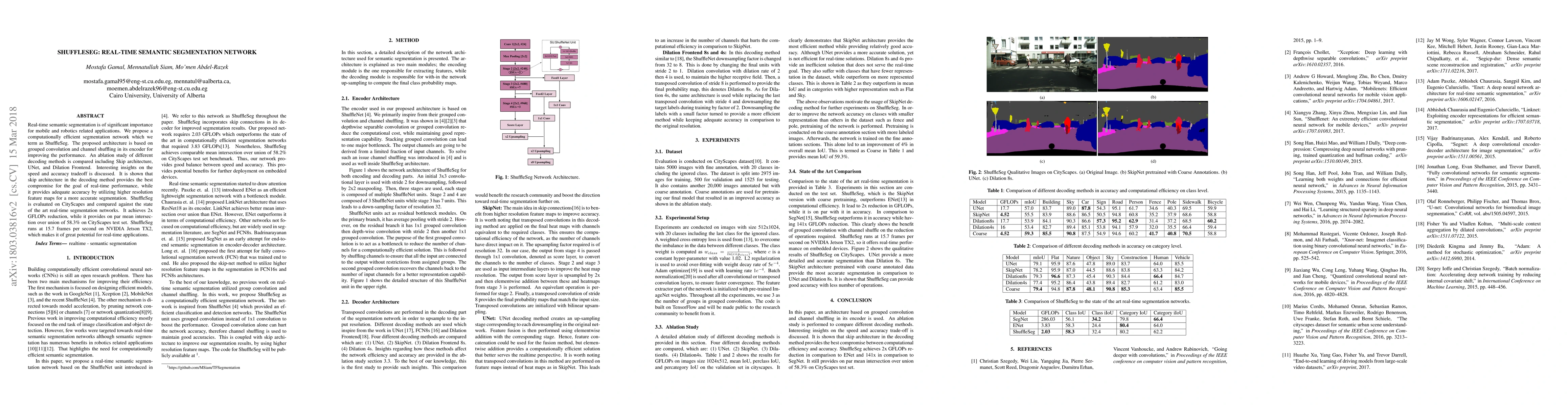 ShuffleSeg is a computationally efficient real-time semantic segmentation network utilizing grouped convolution and channel shuffling for improved performance. It achieves a balance between speed and accuracy, running at 15.7 FPS on NVIDIA Jetson TX2, while maintaining 58.3% mean intersection over union on CityScapes.