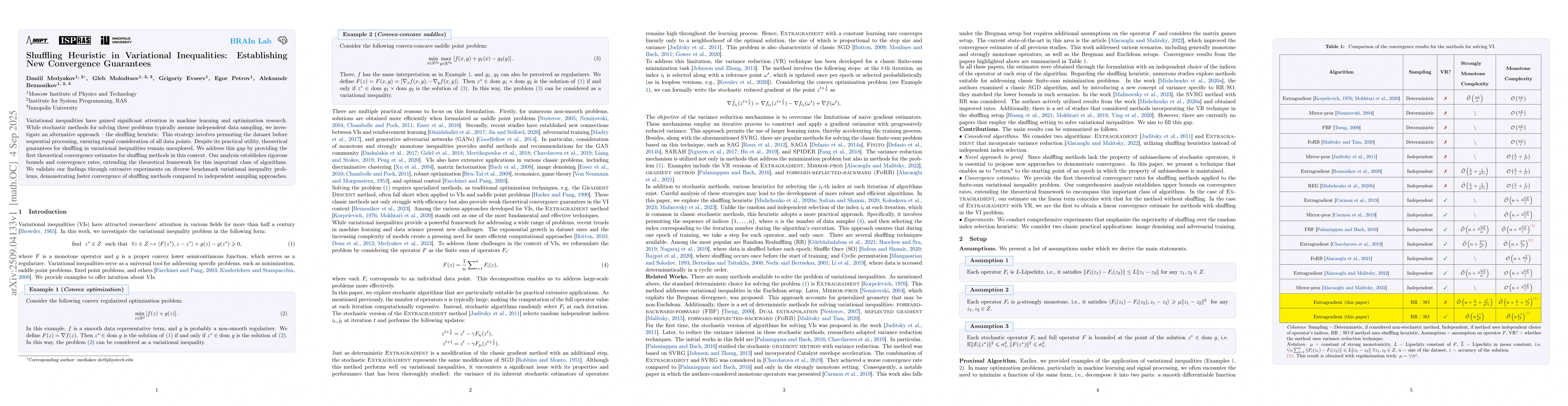 Variational inequalities have gained significant attention in machine learning and optimization research. While stochastic methods for solving these problems typically assume independent data sampling, we investigate an alternative approach -- the shuffling heuristic. This strategy involves permuting the dataset before sequential processing, ensuring equal consideration of all data points. Despite its practical utility, theoretical guarantees for shuffling in variational inequalities remain unexplored. We address this gap by providing the first theoretical convergence estimates for shuffling methods in this context. Our analysis establishes rigorous bounds and convergence rates, extending the theoretical framework for this important class of algorithms. We validate our findings through extensive experiments on diverse benchmark variational inequality problems, demonstrating faster convergence of shuffling methods compared to independent sampling approaches.