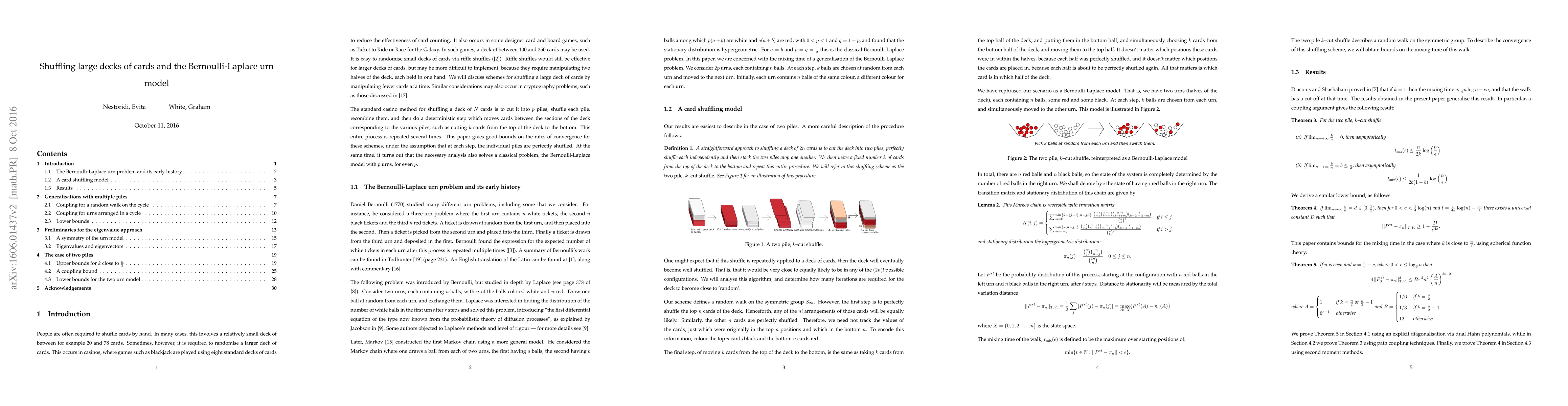 Researchers studied a shuffling process for large decks of cards using the Bernoulli-Laplace urn model, finding bounds on mixing times for the resulting Markov chain.
