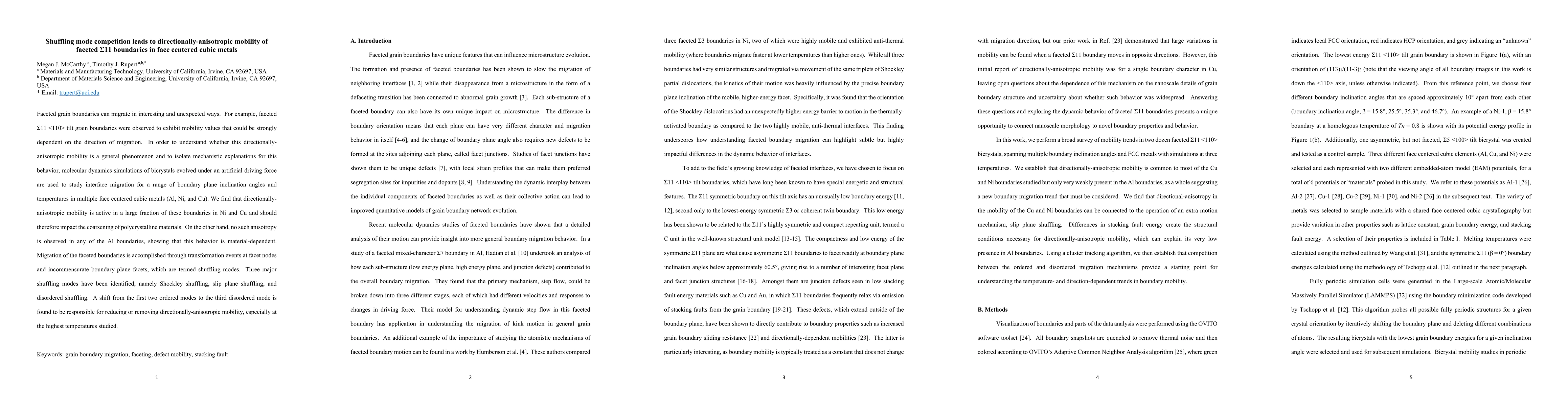 Faceted grain boundaries can migrate in interesting and unexpected ways. For example, faceted {\Sigma}11 <110> tilt grain boundaries were observed to exhibit mobility values that could be strongly dependent on the direction of migration. In order to understand whether this directionally-anisotropic mobility is a general phenomenon and to isolate mechanistic explanations for this behavior, molecular dynamics simulations of bicrystals evolved under an artificial driving force are used to study interface migration for a range of boundary plane inclination angles and temperatures in multiple face centered cubic metals (Al, Ni, and Cu). We find that directionally-anisotropic mobility is active in a large fraction of these boundaries in Ni and Cu and should therefore impact the coarsening of polycrystalline materials. On the other hand, no such anisotropy is observed in any of the Al boundaries, showing that this behavior is material-dependent. Migration of the faceted boundaries is accomplished through transformation events at facet nodes and incommensurate boundary plane facets, which are termed shuffling modes. Three major shuffling modes have been identified, namely Shockley shuffling, slip plane shuffling, and disordered shuffling. A shift from the first two ordered modes to the third disordered mode is found to be responsible for reducing or removing directionally-anisotropic mobility, especially at the highest temperatures studied.