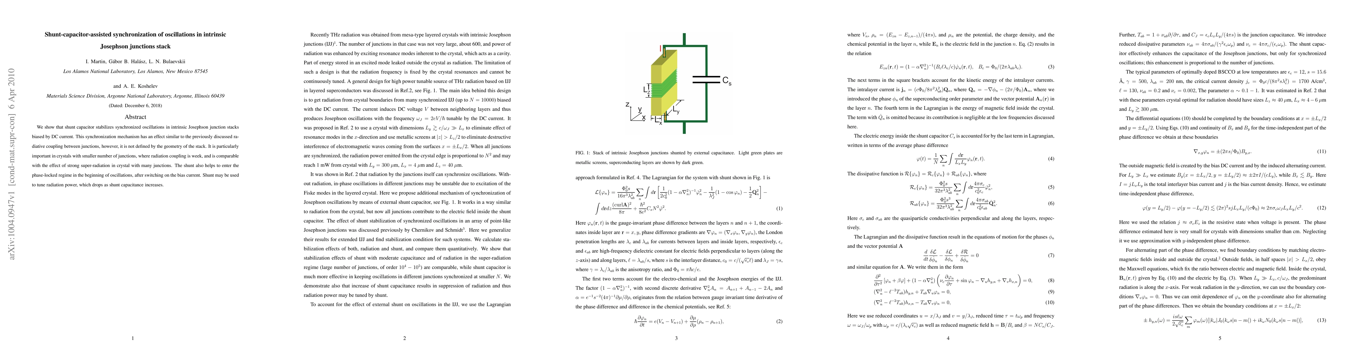This paper demonstrates that shunt capacitors stabilize synchronized oscillations in intrinsic Josephson junction stacks under DC current, providing an alternative synchronization mechanism independent of the stack's geometry. This method is especially beneficial in crystals with fewer junctions where radiative coupling is weak.