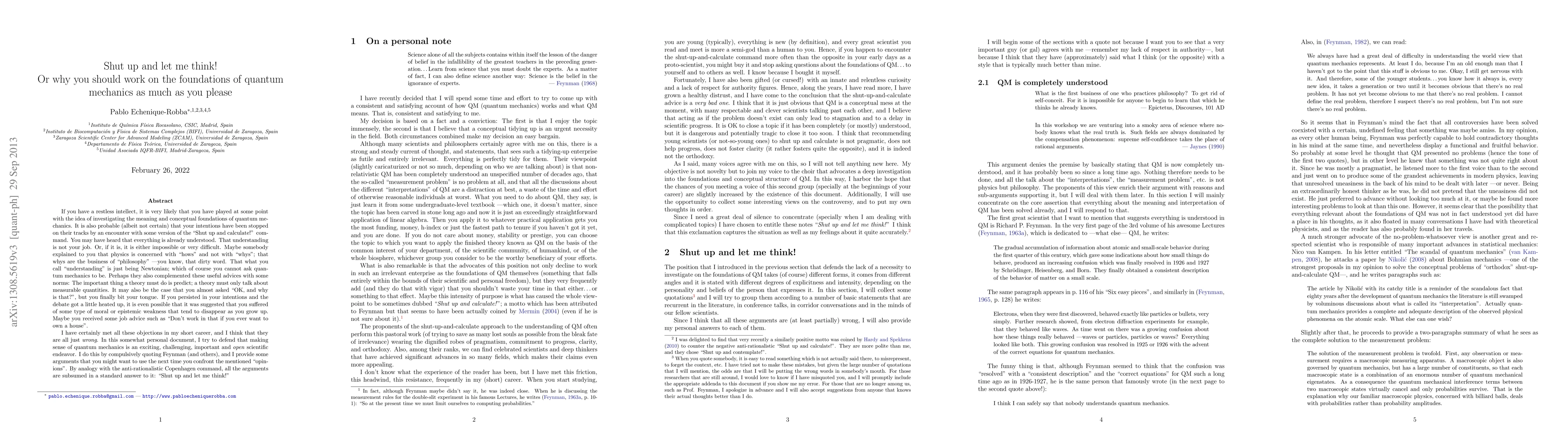 If you have a restless intellect, it is very likely that you have played at some point with the idea of investigating the meaning and conceptual foundations of quantum mechanics. It is also probable (albeit not certain) that your intentions have been stopped on their tracks by an encounter with some version of the "Shut up and calculate" command. You may have heard that everything is already understood. That understanding is not your job. Or, if it is, it is either impossible or very difficult. Maybe somebody explained to you that physics is concerned with "hows" and not with "whys"; that whys are the business of "philosophy" ---you know, that dirty word. That what you call "understanding" is just being Newtonian; which of course you cannot ask quantum mechanics to be. Perhaps they also added some norms: The important thing a theory must do is predict; a theory must only talk about measurable quantities. It may also be the case that you almost asked "OK, and why is that?", but you finally bit your tongue. If you persisted in your intentions and the debate got a little heated up, it is even possible that it was suggested that you suffered of some type of moral or epistemic weakness that tend to disappear as you grow up. Maybe you received some job advice such as "Don't work in that if you ever want to own a house". I have certainly met all these objections in my short career, and I think that they are all just wrong. In this somewhat personal document, I try to defend that making sense of quantum mechanics is an exciting, challenging, important and open scientific endeavor. I do this by compulsively quoting Feynman (and others), and I provide some arguments that you might want to use the next time you confront the mentioned "opinions". By analogy with the anti-rationalistic Copenhagen command, all the arguments are subsumed in a standard answer to it: "Shut up and let me think"